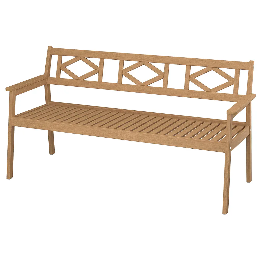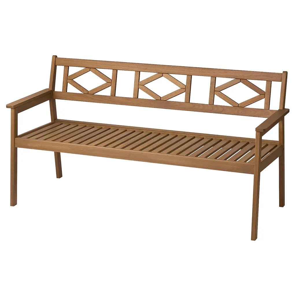 BONDHOLMEN Bench with backrest, outdoor - brown. To make the bench with backrest as comfortable as possible for you, we designed it with generous proportions for both the seat and the armrests so they provide good support. By adding a cushion, you and your guests sit even more comfortably.