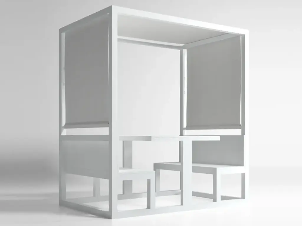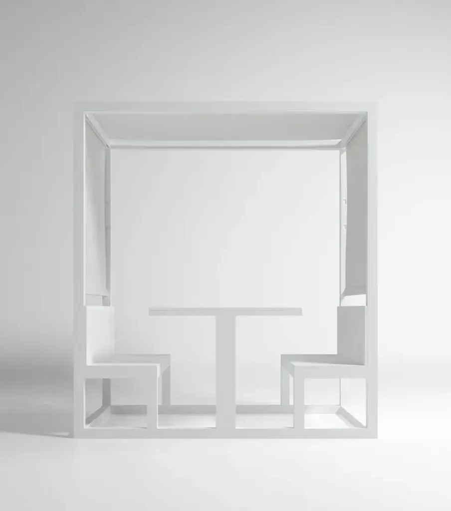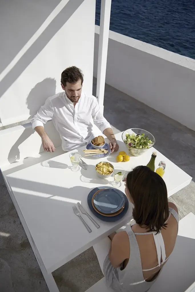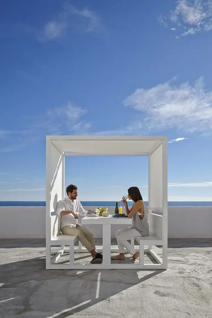 “During a meal we share more anecdotes and little stories with our friends than at any other time. Our garden pavilions arose from our quest to provide a contemporary space for people who like eating together in natural surroundings.”Made of anodized or thermo-lacquered aluminium profiles and polyethylene. Canopy of plastic fabric.Collections colour sample: anodized, white, agate grey, cement grey, sand, bronze, wine red, blue grey, grey blue, anthracite and black.