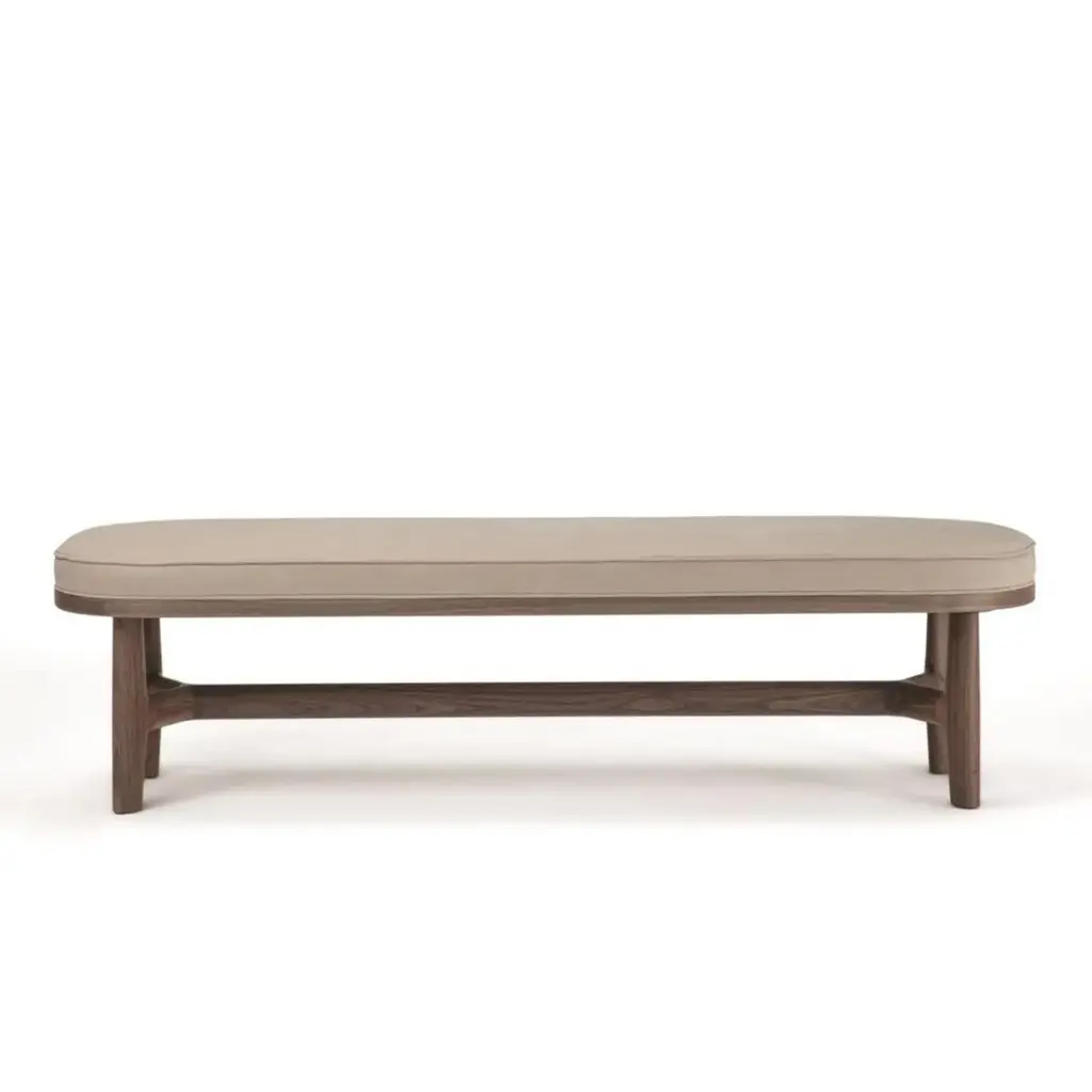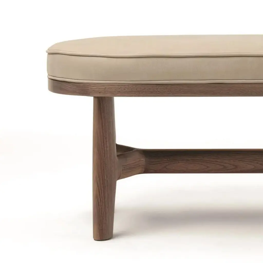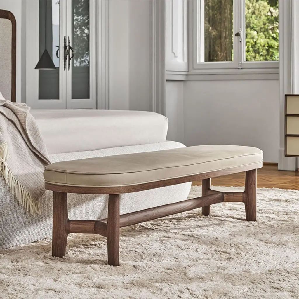 Bench Boudoir Walnut with solid walnut wood base and withset upholstered and covered with genuine leather in Corda finish. Also available with other leather color or fabrics, on request.