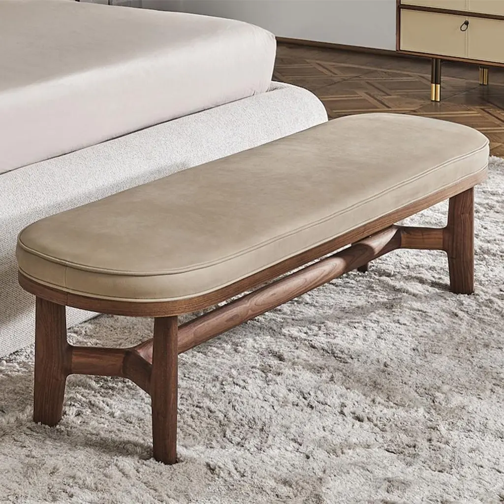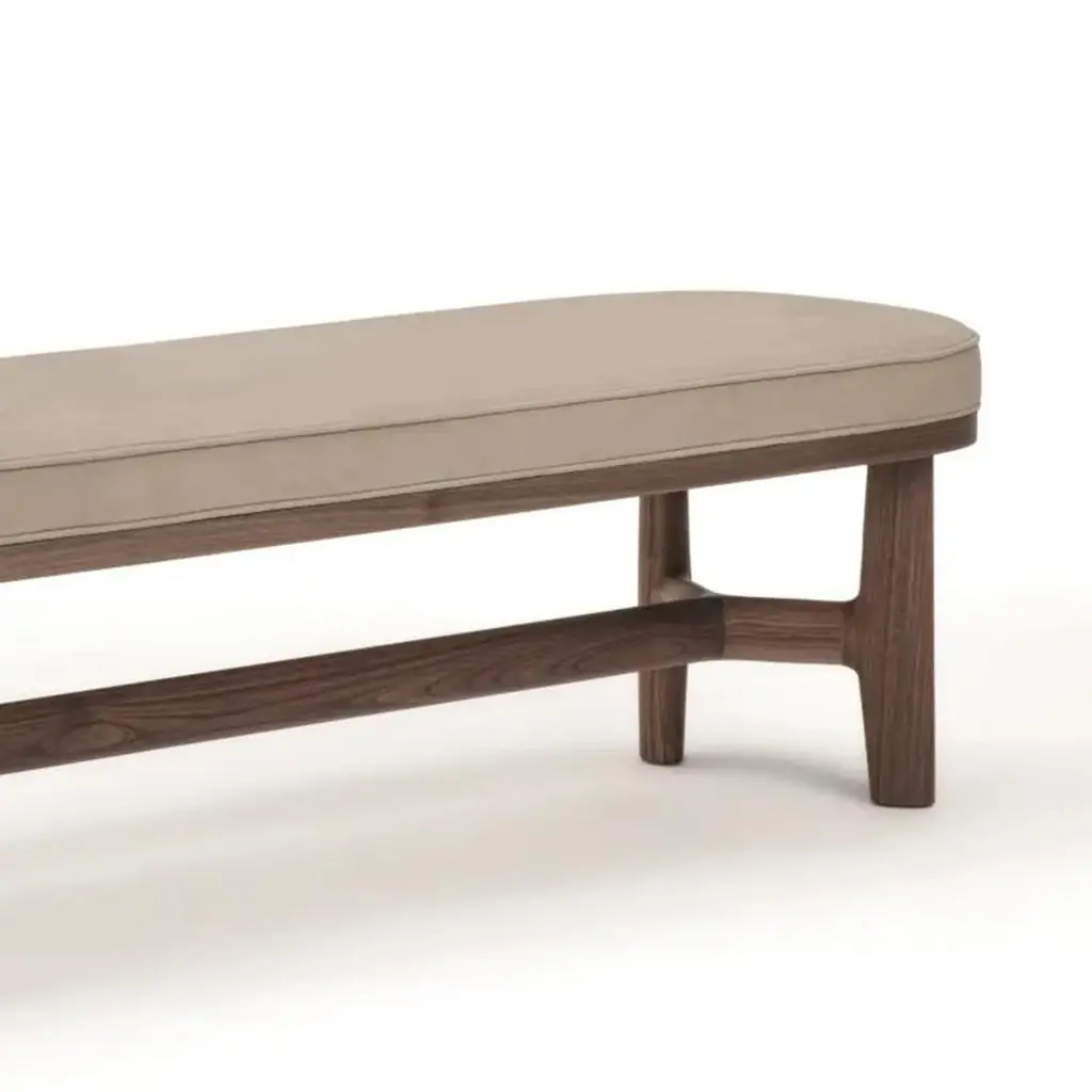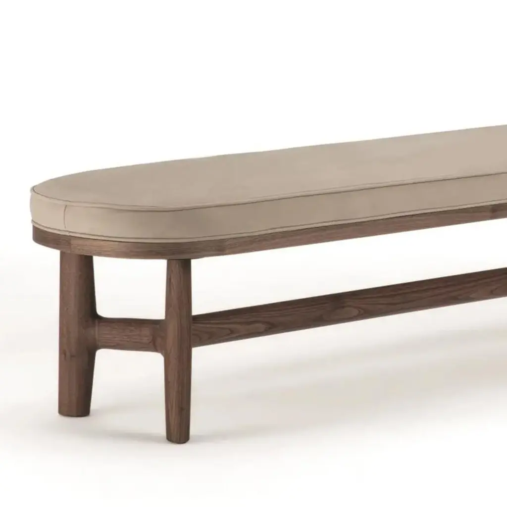 Bench Boudoir Walnut with solid walnut wood base and withset upholstered and covered with genuine leather in Corda finish. Also available with other leather color or fabrics, on request.