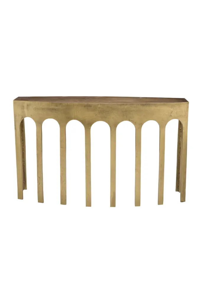 Bow bench by 101 Copenhagen. Designed by Kristian Sofus Hansen & Tommy Hyldahl. Dimensions: L70 / W30 /H42 cm. Materials: fiber concrete. The Bow console is inspired by the architectural Brutalism movement of the mid-20th century. The design of the console draws parallels to the old aqueducts from the Roman Empire and classic architectural geometry. Repetition of arches are creating a beautiful silhouette combining architecture and design, creating a boxy and pure design classic. The Bow console are cast in lightweight fiber concrete to create a unique textured surface and increase mobility. The console are hand painted with multiple layers of paint, creating a strong and resistant surface