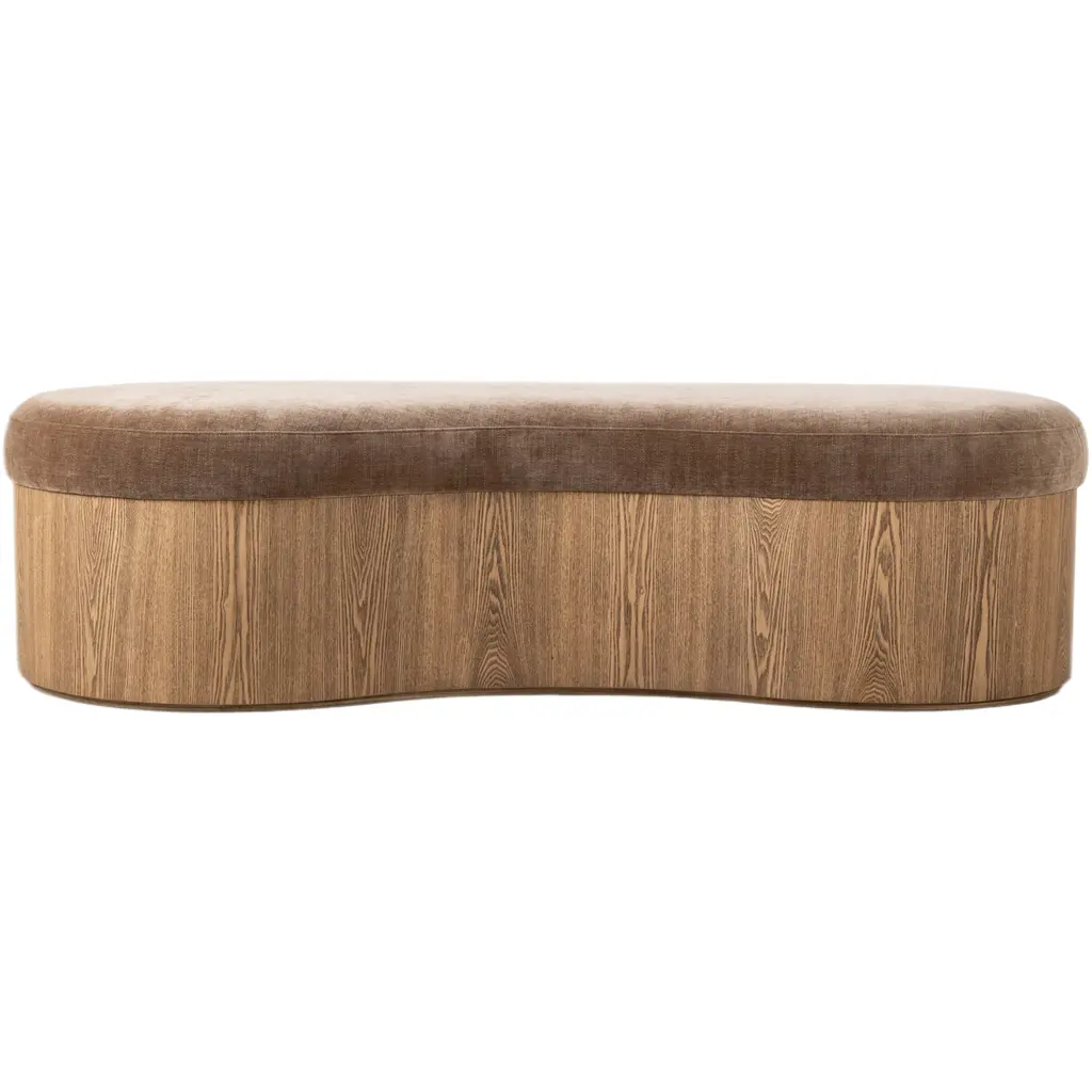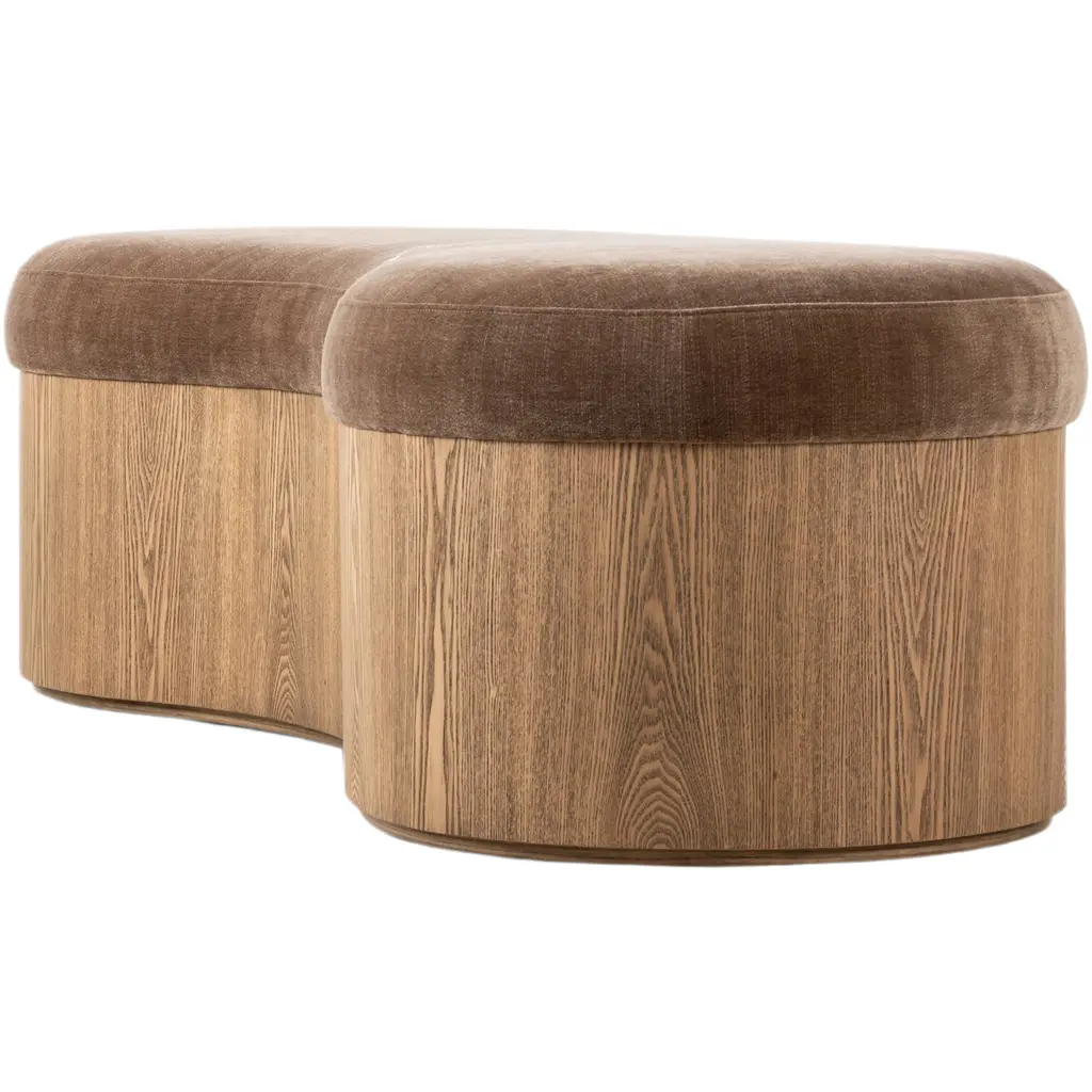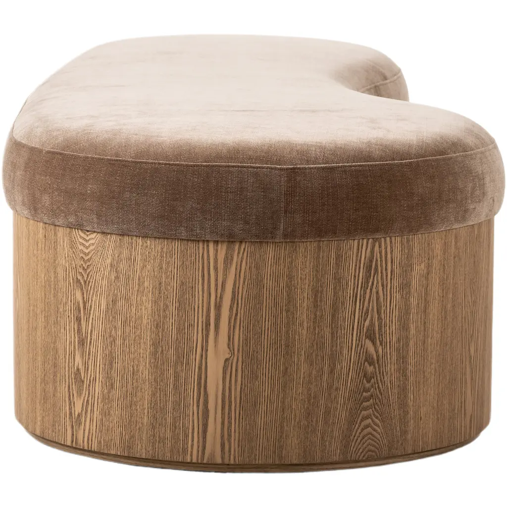 The Brookstead Accent Bench is designed to elevate any room with its curvy, statement-making presence. It features a unique kidney-shaped base crafted from toasted ash veneer, providing a sturdy and stylish foundation. The seat is soft and velvety, offering both comfort and a touch of luxury. This bench is a perfect blend of form and function, making it an ideal addition to any space seeking a sophisticated accent.