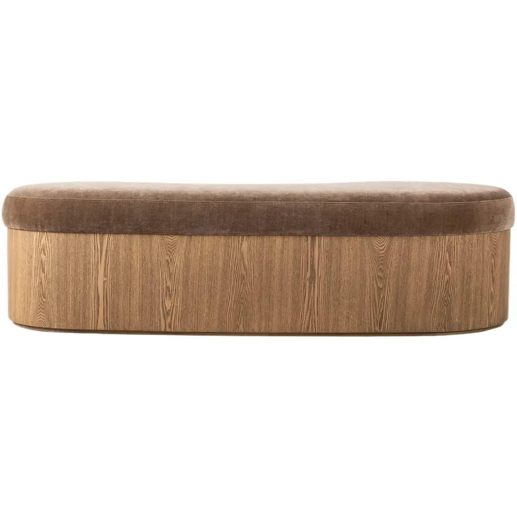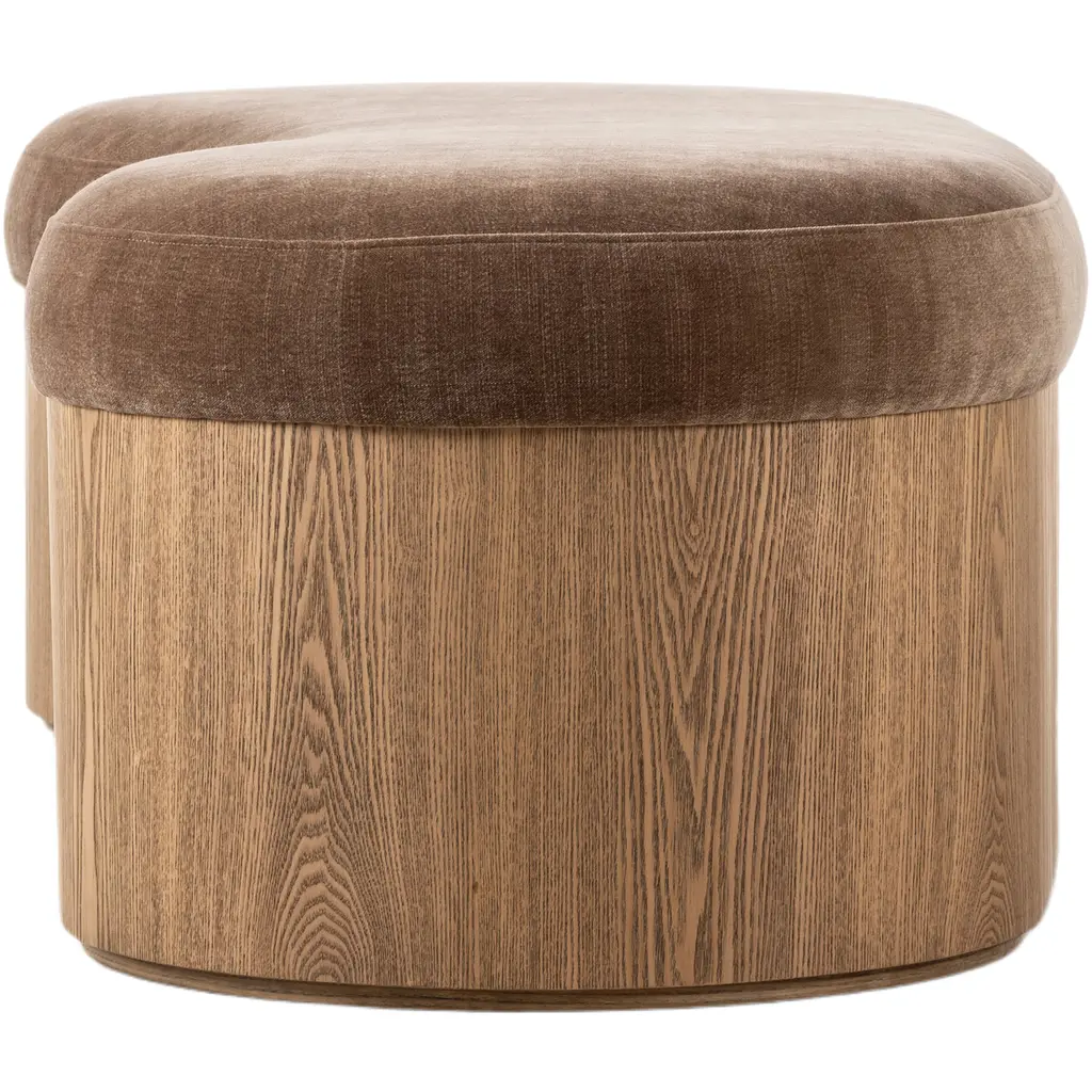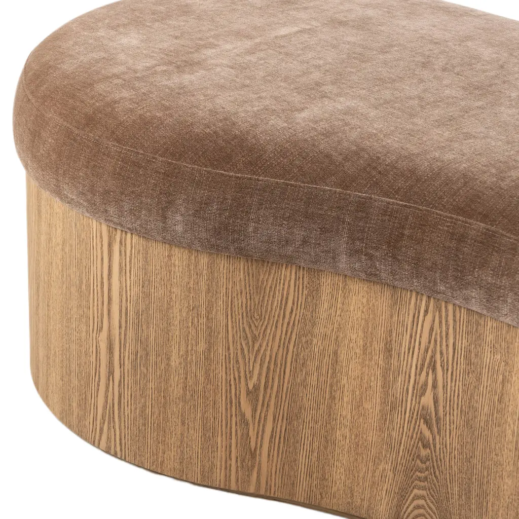 The Brookstead Accent Bench is designed to elevate any room with its curvy, statement-making presence. It features a unique kidney-shaped base crafted from toasted ash veneer, providing a sturdy and stylish foundation. The seat is soft and velvety, offering both comfort and a touch of luxury. This bench is a perfect blend of form and function, making it an ideal addition to any space seeking a sophisticated accent.