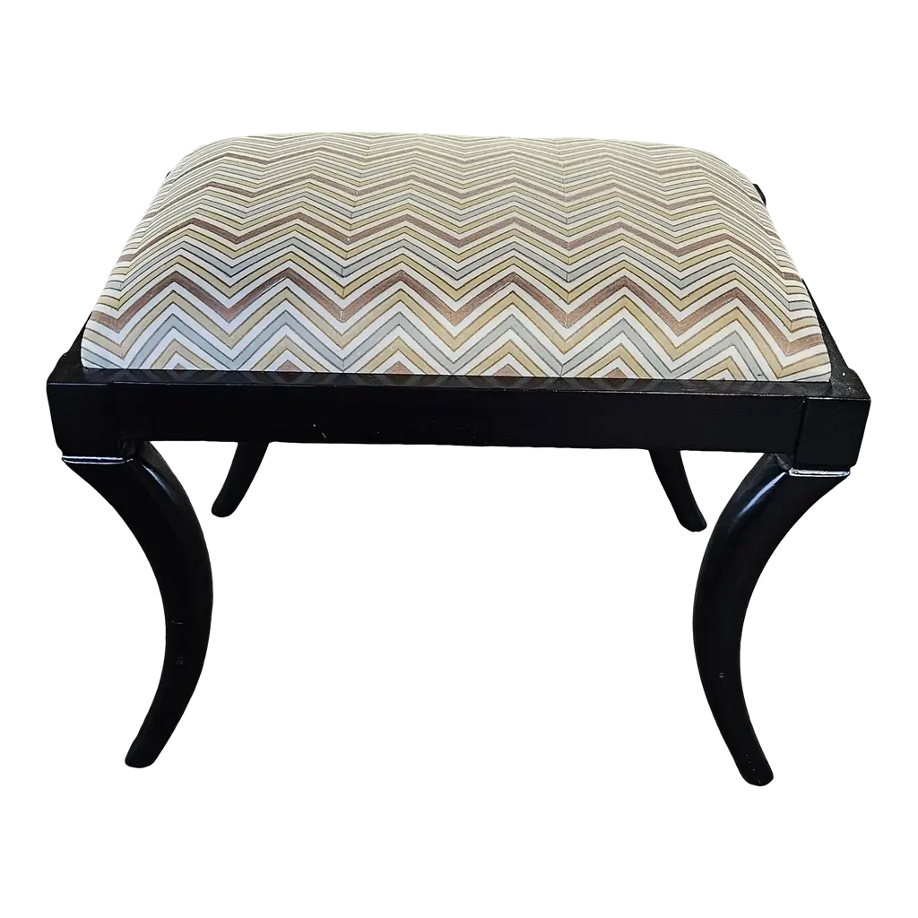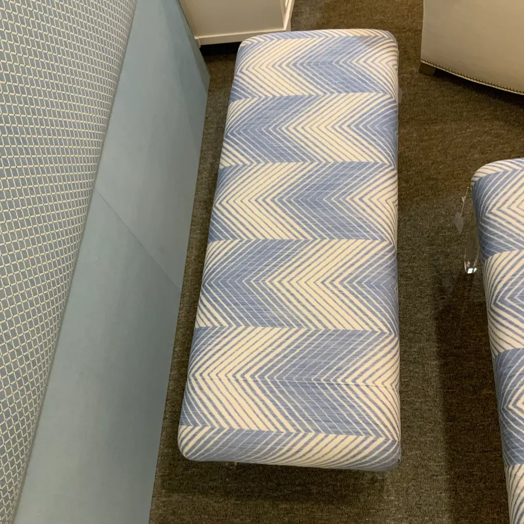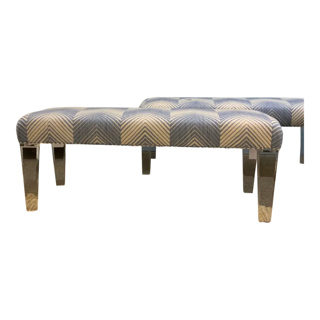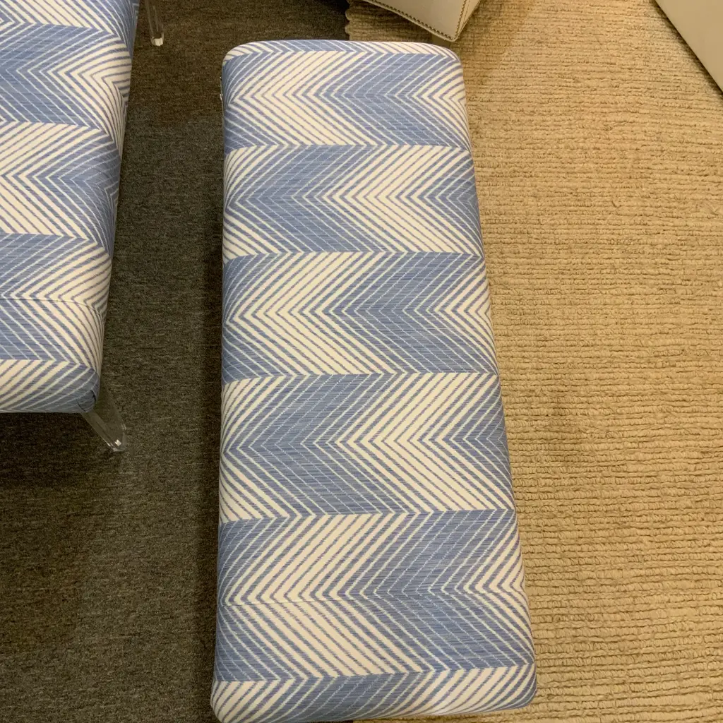 Brunshwig & Fils custom fabric, blue and white Chevron with lucite legs. There are two identical available.