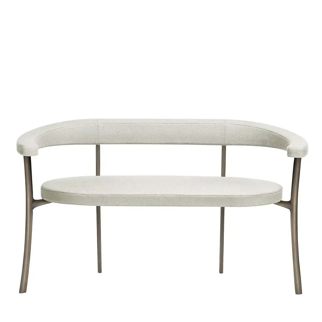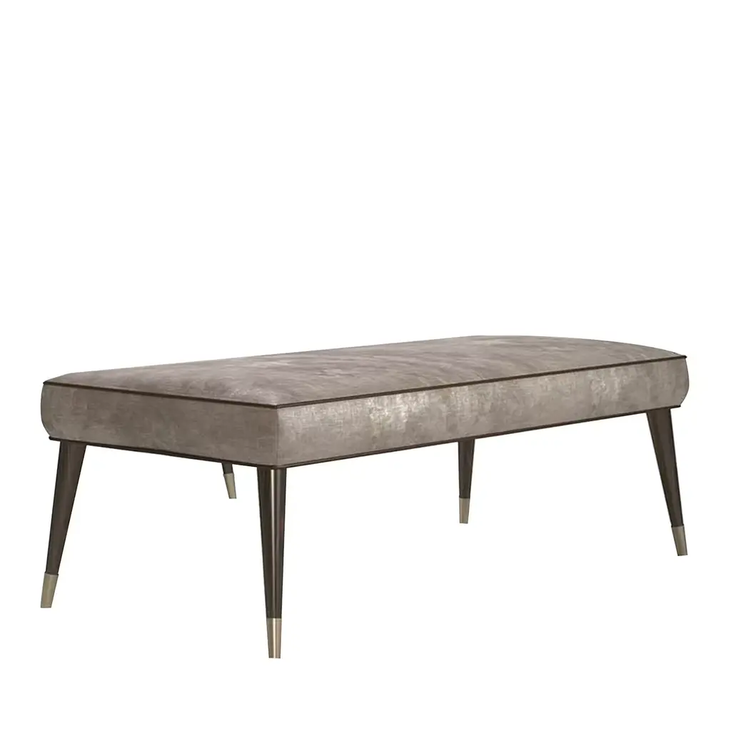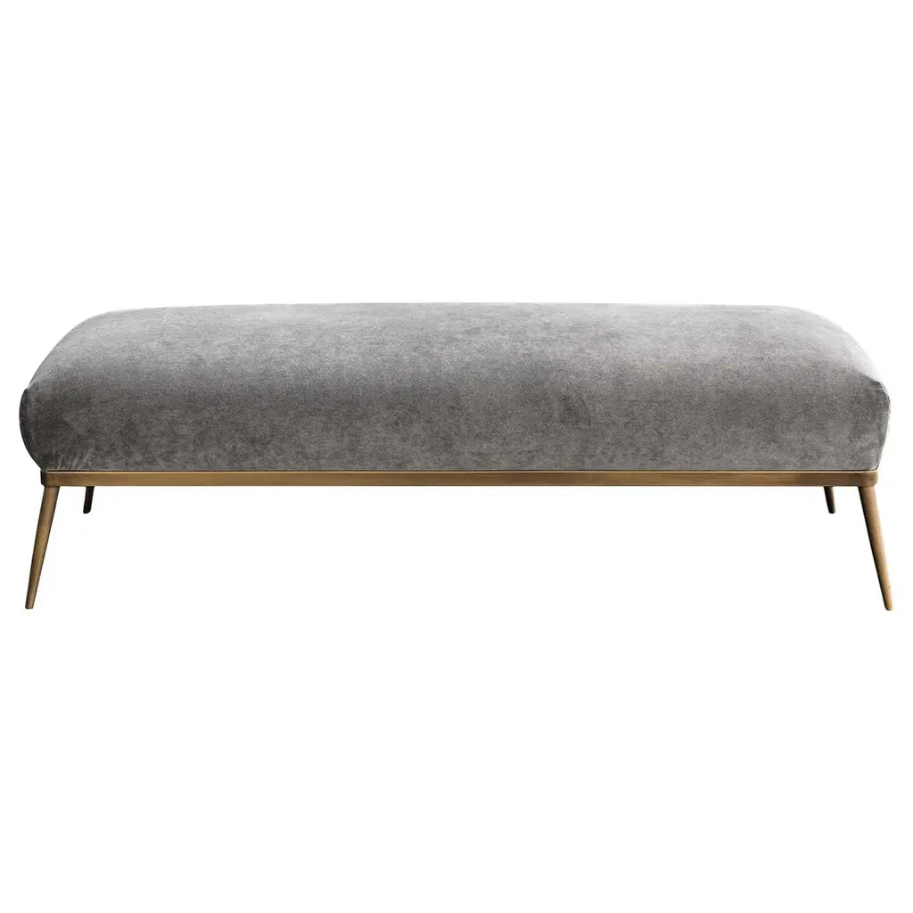 Merging mid-century austerity with Hollywood glamour, the upholstered gray leather seat of this elongated bench (in the picture fabric nabouk leather in tortora 215 color) is balanced on delicately semicircular burnished brass legs. A welcoming seat in an entryway, at the end of a bed, or even as a coffee table, this bench reflects a sense of refined and exquisite quality, combined with the highest attention to detail. Contract and commercial certifications available upon request.