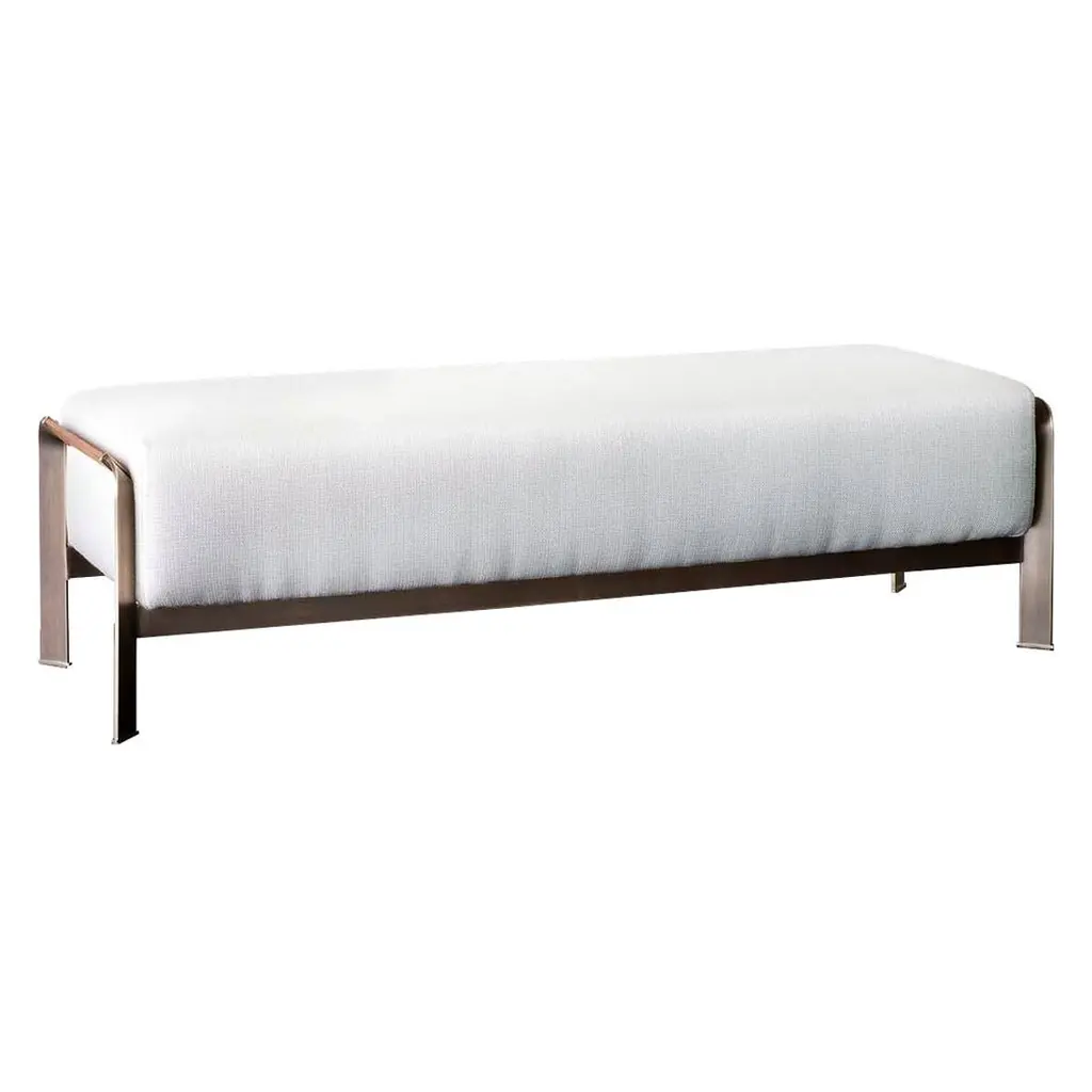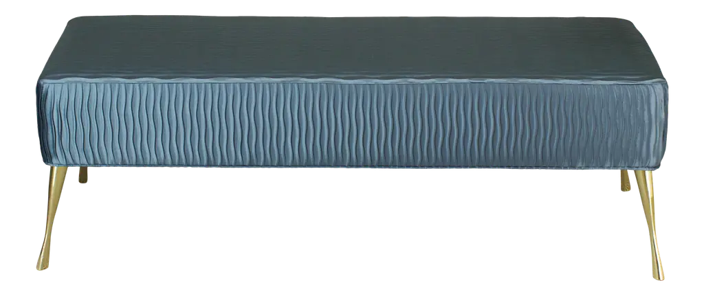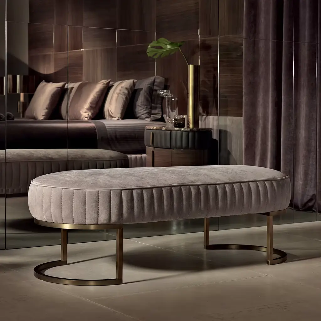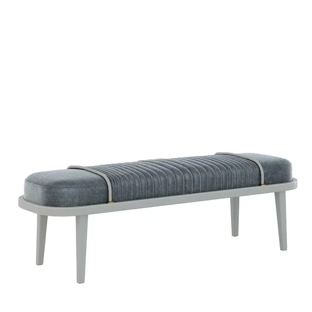 Merging mid-century austerity with Hollywood glamour, the upholstered gray leather seat of this elongated bench (in the picture fabric nabouk leather in tortora 215 color) is balanced on delicately semicircular burnished brass legs. A welcoming seat in an entryway, at the end of a bed, or even as a coffee table, this bench reflects a sense of refined and exquisite quality, combined with the highest attention to detail. Contract and commercial certifications available upon request.