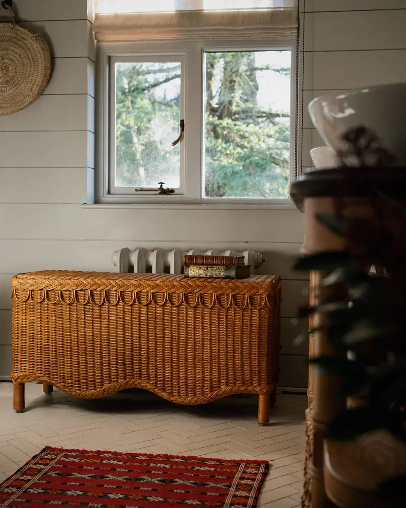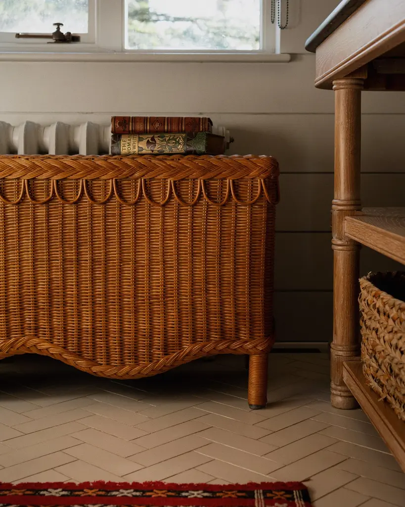 Hand-crafted from 100% natural rattan, the Bunny bench sits neatly at the foot of a bed, adjacent to the base of stairs, by the front door (perfect for putting on shoes), plus it also looks fabulous as a mini coffee table. Sharland England’s signature braiding and loops run around the rim, and a scalloped hem makes the wicker feel like a beautifully draped tablecloth.