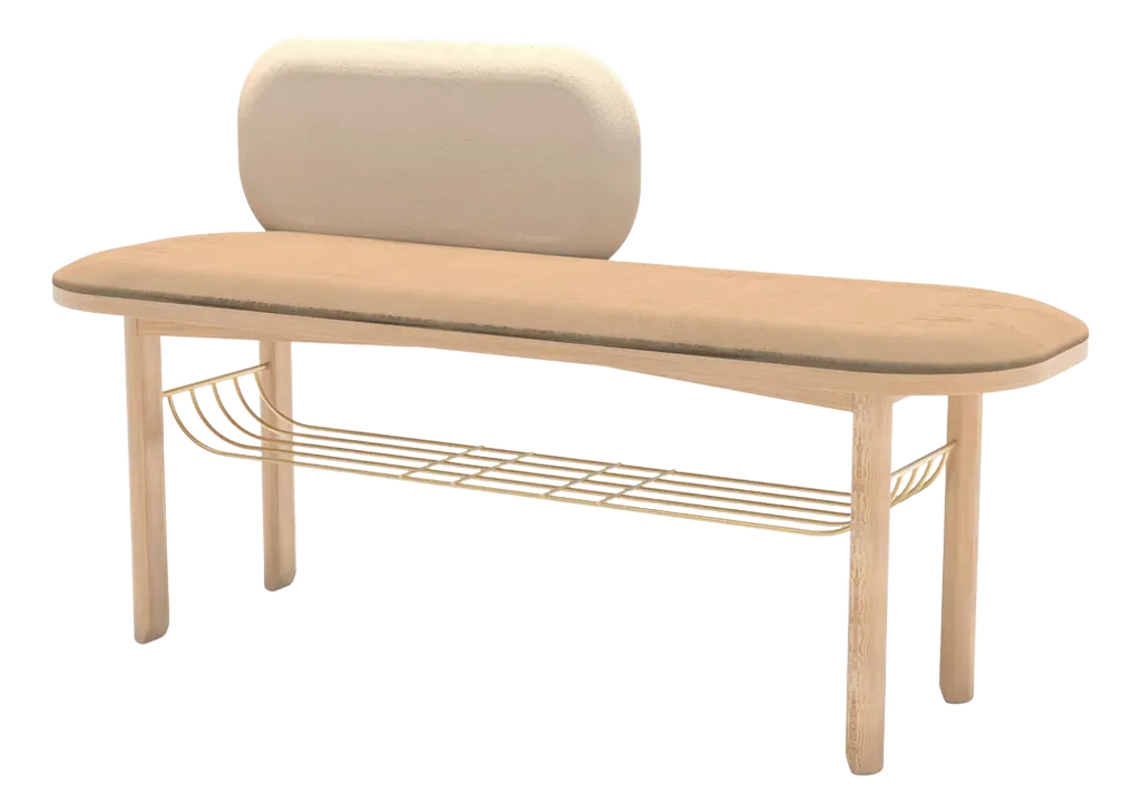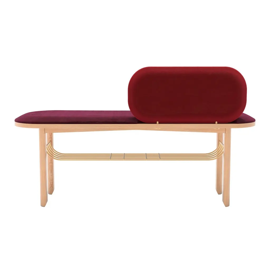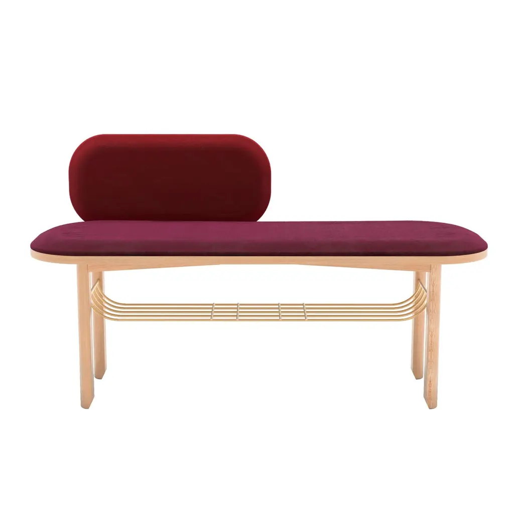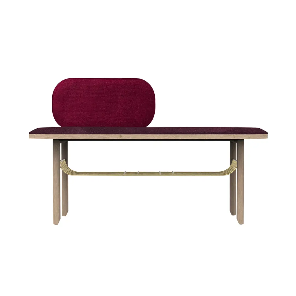 Burgundy Eustache Bench Natural Oak by HARTODimensions: W 120 x D 40 x H 74 cm. Materials: Solid wood, Wood veneered MDF, Velvet, Metal, Foam.Weight: 24.5 kgThe Eustache bench is as practical as it is elegant, with its boudoir velvet, its neat finishes and its brass-coloured metal basket. In an entrance hall or bedroom, it is the essential bench where you can take off your shoes, put down your jacket and put away your shoes. The Eustache entrance bench is made in Portugal, it is composed of a solid oak structure filled with foam covered in velvet, and a hanging basket in brass-colored lacquered metal. The Eustache bench is a creation of Margaux Keller.About: Hartô, a French furniture brand, was born in 2012 from the desire of its founders to offer a different design, less elitist, which combines the useful with the beautiful. A light, joyful design, as if to say "I'm fed up" (with boring furniture): this is the meaning of the word harto in Spanish. The first pieces of the collection, the desks offer a new vision on a market that was then quite sparse, and offer functional tips and a joyful, colorful design, out of step with the archetypes. The foundations of the Hartô spirit are laid: a free spirit, a design of the useful, curved shapes, colors. In a word: creativity! And of course, from the beginning, this translates into collaborations with talented designers. This spirit crosses the years and the collections, evolves, refines itself, without ever denying itself. Today, audacity and creativity are still there, and are translated in a subtle way, all in elegance. At Hartô, the freedom to create is also based on strong commitments to quality and durability: the furniture is made by the best local craftsmen, who use noble materials to give life to pieces that will last through the ages.