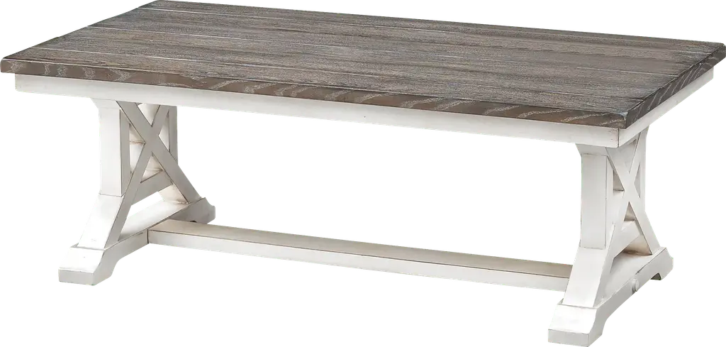 Set the stage for casual entertaining with the Bywood cocktail table finished in a light cream with a top of natural wood grained plank construction. The trestle style base has an X cross design on the legs and a lower crossbar, and the spacious surface provides plenty of room for games, puzzles or snacks. Perfect alone, but we also offer many coordinating pieces for you to pick and choose from in order to create the family fun room you have always wanted Customer assembly is required.