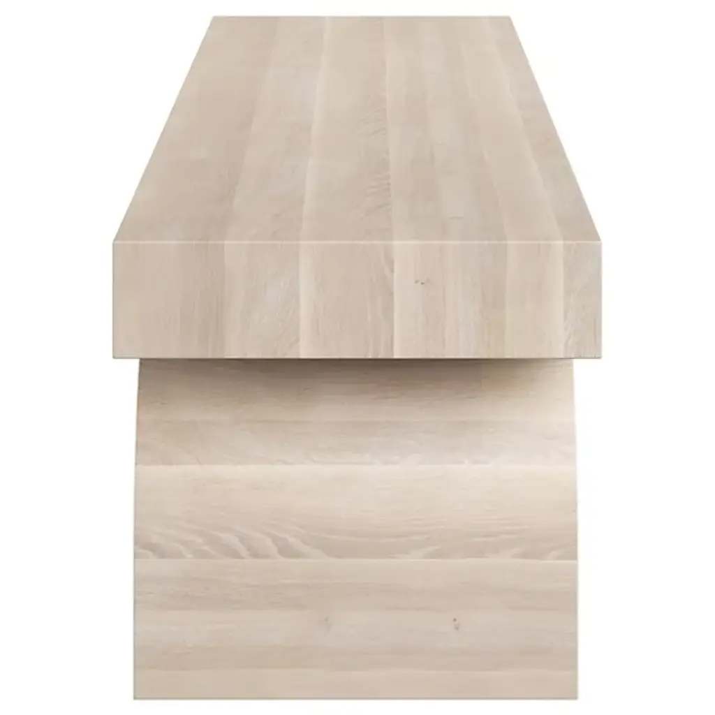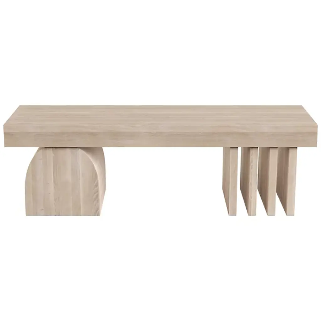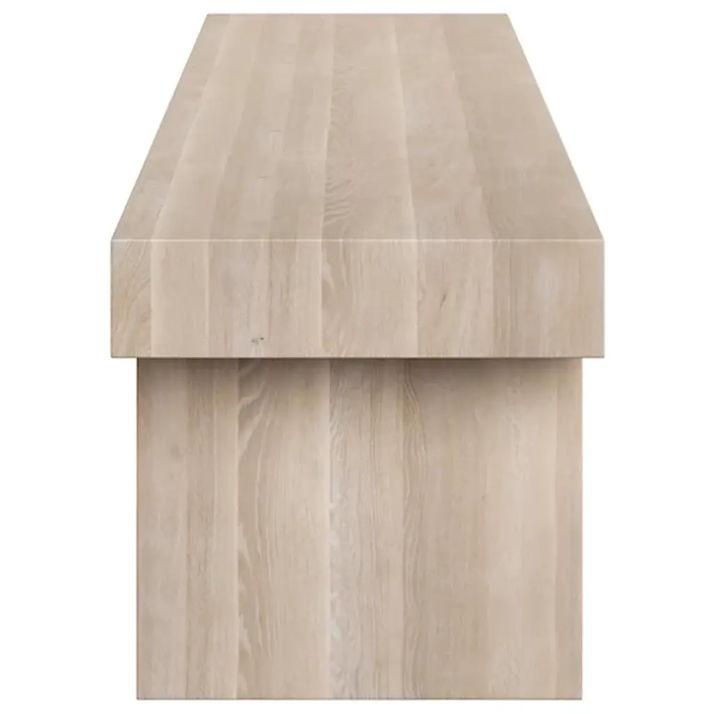 Discover the Cadence Bench from Sunpan, a bold contemporary design statement. This one-of-a-kind bench showcases a captivating geometric base, meticulously crafted from solid light oak wood with a chic whitewash finish. The beauty of natural imperfections is on full display, as the organic, porous nature of wood lends a unique texture, along with fine indentations, cracks, and variations in color and grain. A rounded base on one side contrasts with a series of four plates on the other, enhancing the character of the piece and making it a striking addition to any contemporary space.