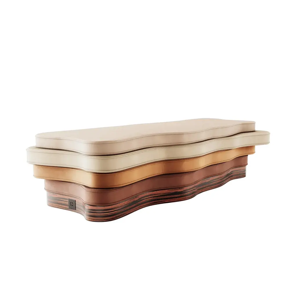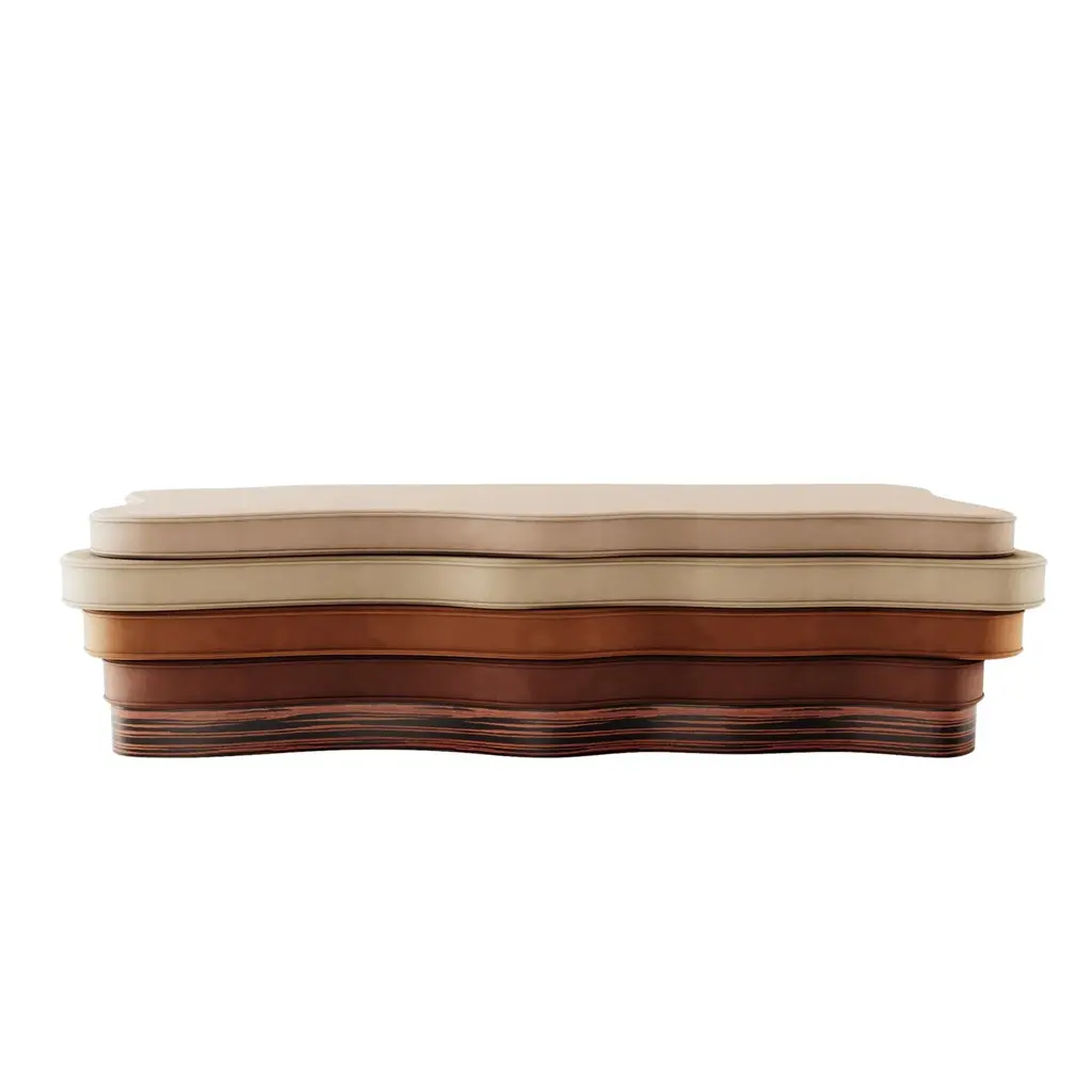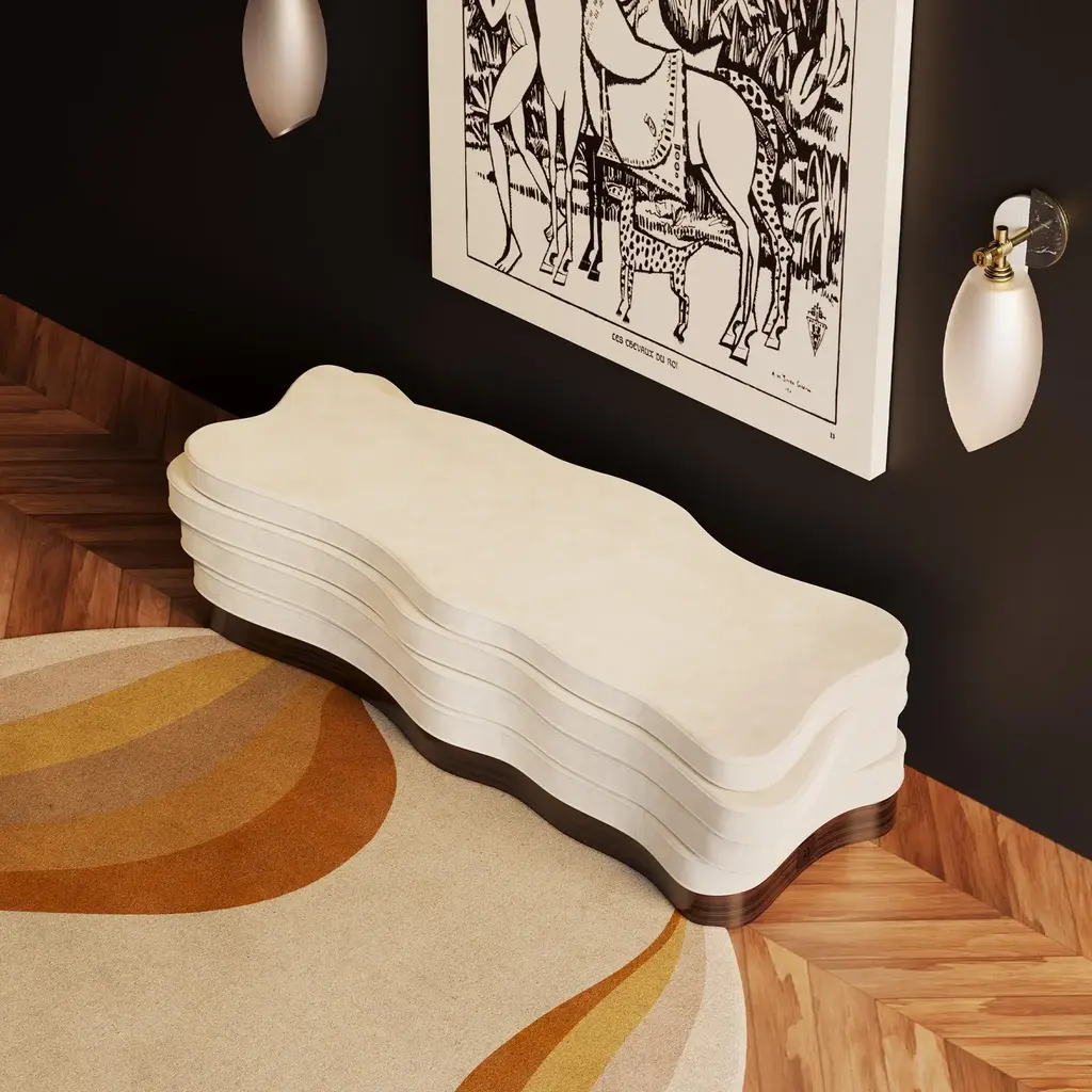 Cadiz Bench combines bold shapes with extreme attention to comfort. A modern bench with a Memphis-style inspiration is ideal for any contemporary seating area or a luxury entryway. MATERIALS: Upholstered in Velvet; Base in Ebony Veneer.
