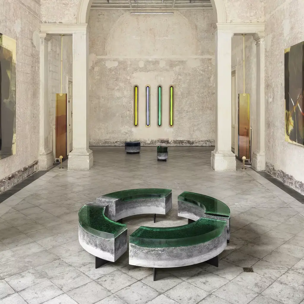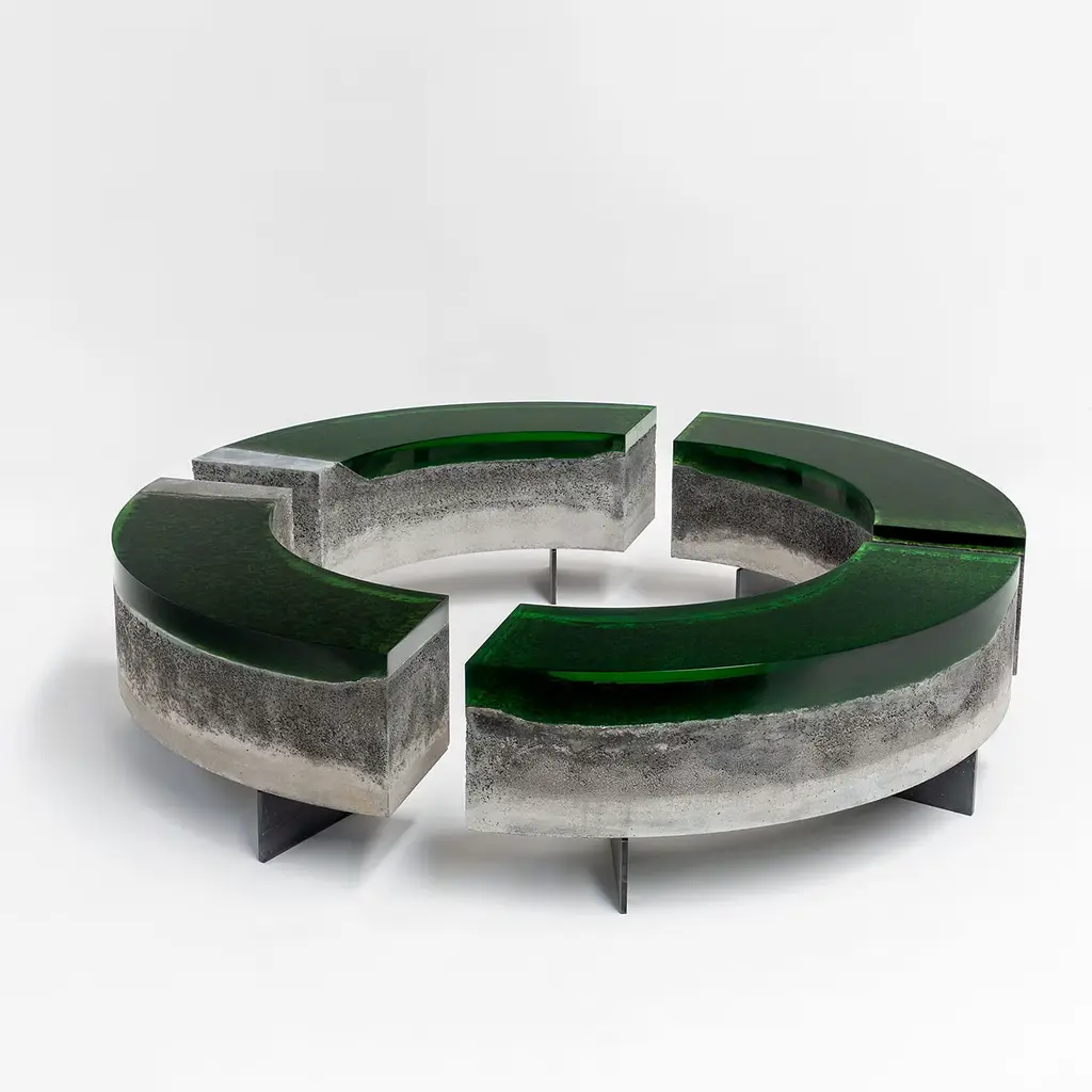 Evolving from its namesake coffee tables, the Cala bench comprises a coarse concrete base covered with thick epoxy resin, evoking the lacustrine landscape of Como. Resin is cast in layers to recreate a deep and shifting top, that seems to reveal the lakebed underneath. The asymmetric composition and rounded shapes resemble the jagged shores smoothed by flowing water. The full set consists of four pieces that can be positioned in a circle or inverted and alternated to create dynamic layouts. Available in different colors.