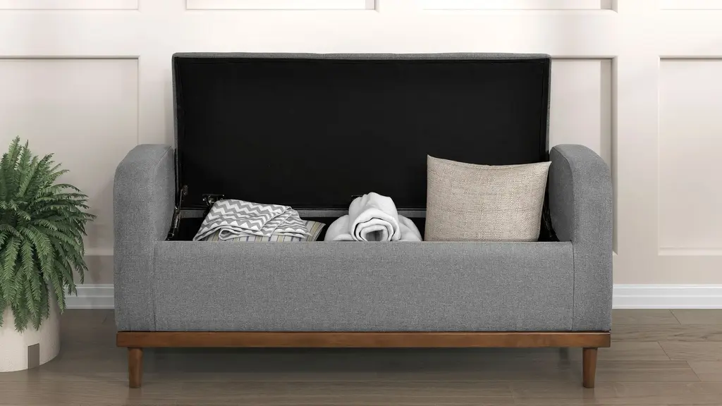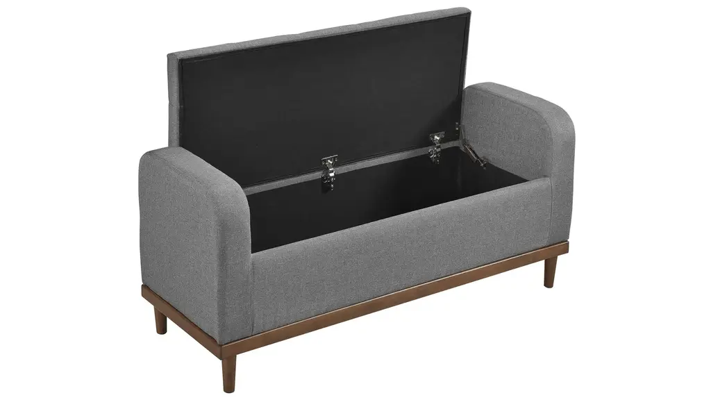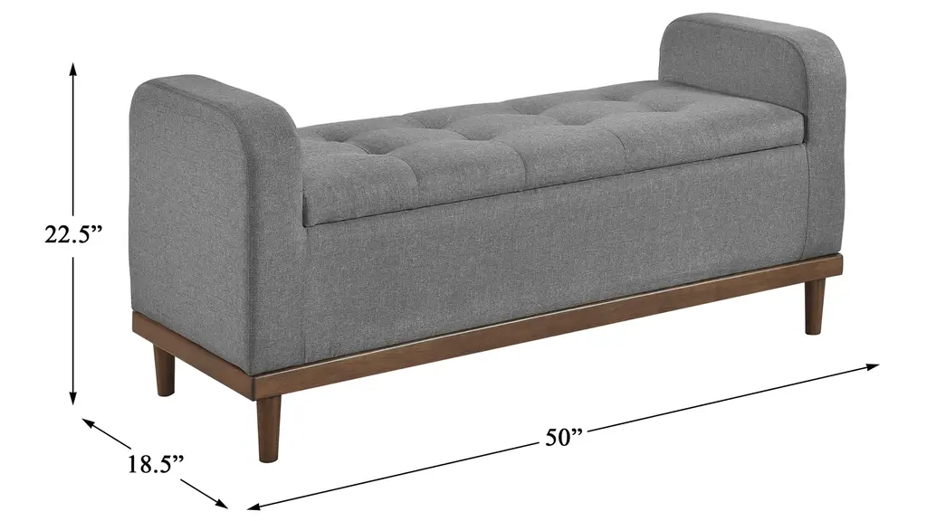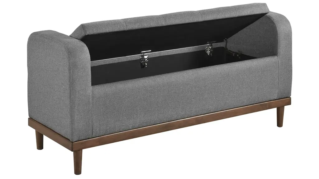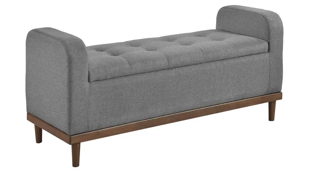 Mid-Century Modern lines define the design of the Calix Lift Top Storage Bench, providing both seating and storage in one functional piece. The accent bench's interior space creates function beyond the button-tufted lift-top seat, providing the perfect space to store your decorative pillows and blankets. The textured fabric upholstery that covers the storage ottoman is perfectly complemented by the walnut finish of the solid wood support frame.