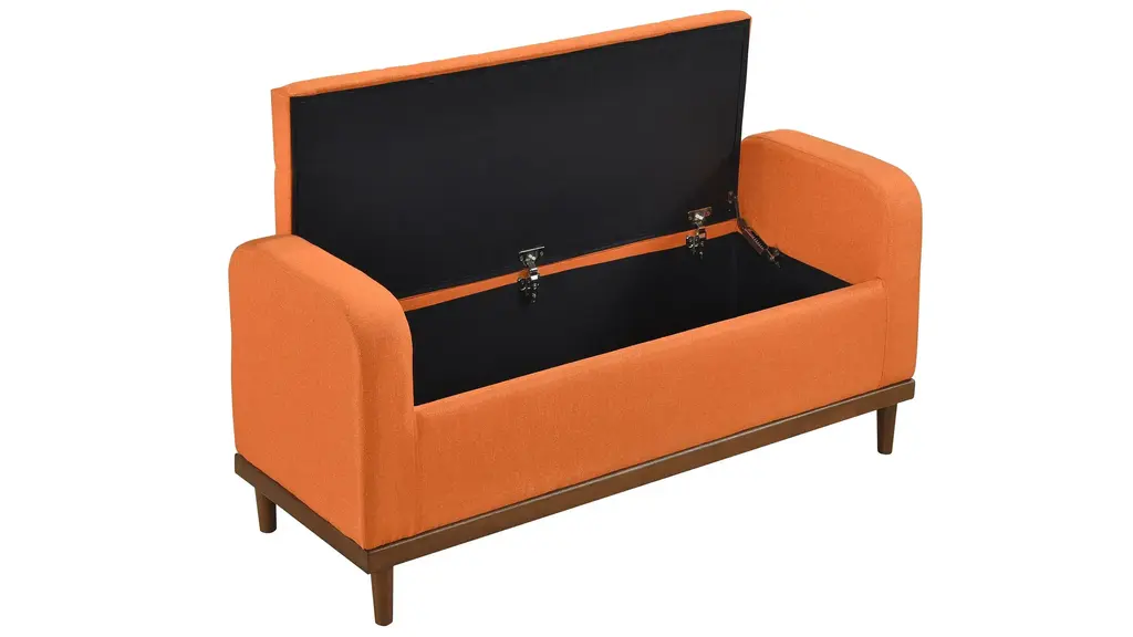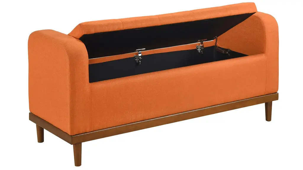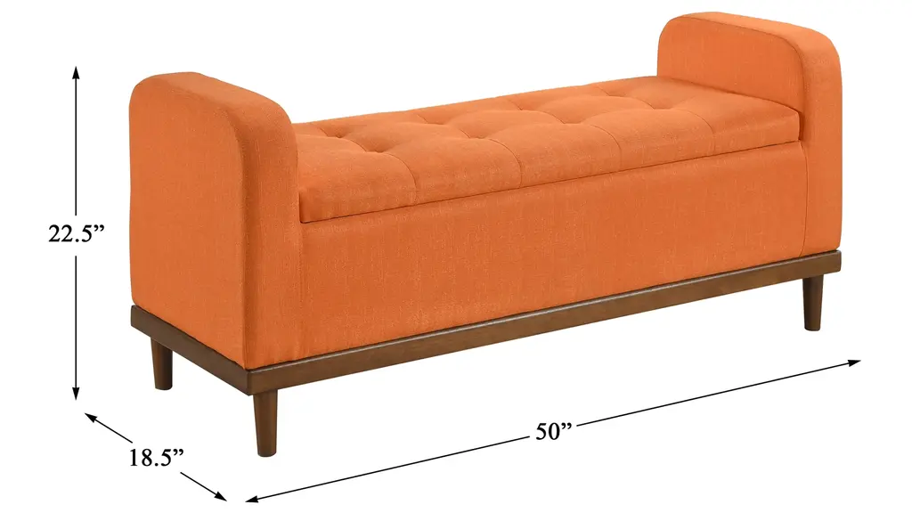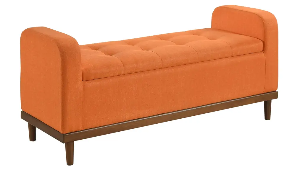 Mid-Century Modern lines define the design of the Calix Lift Top Storage Bench, providing both seating and storage in one functional piece. The accent bench's interior space creates function beyond the button-tufted lift-top seat, providing the perfect space to store your decorative pillows and blankets. The textured fabric upholstery that covers the storage ottoman is perfectly complemented by the walnut finish of the solid wood support frame.