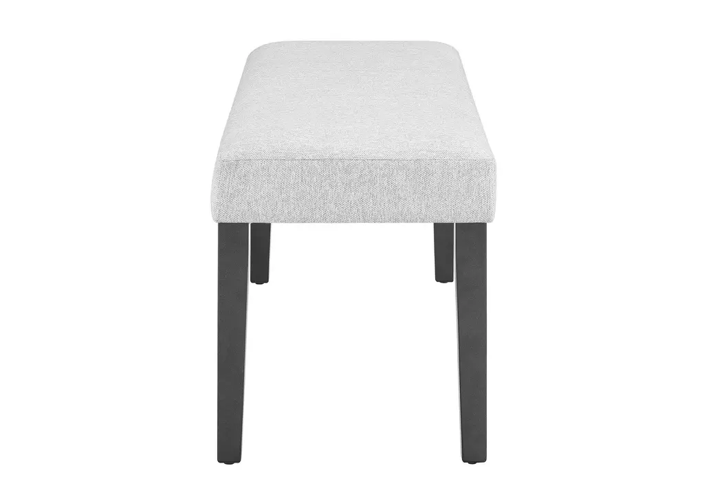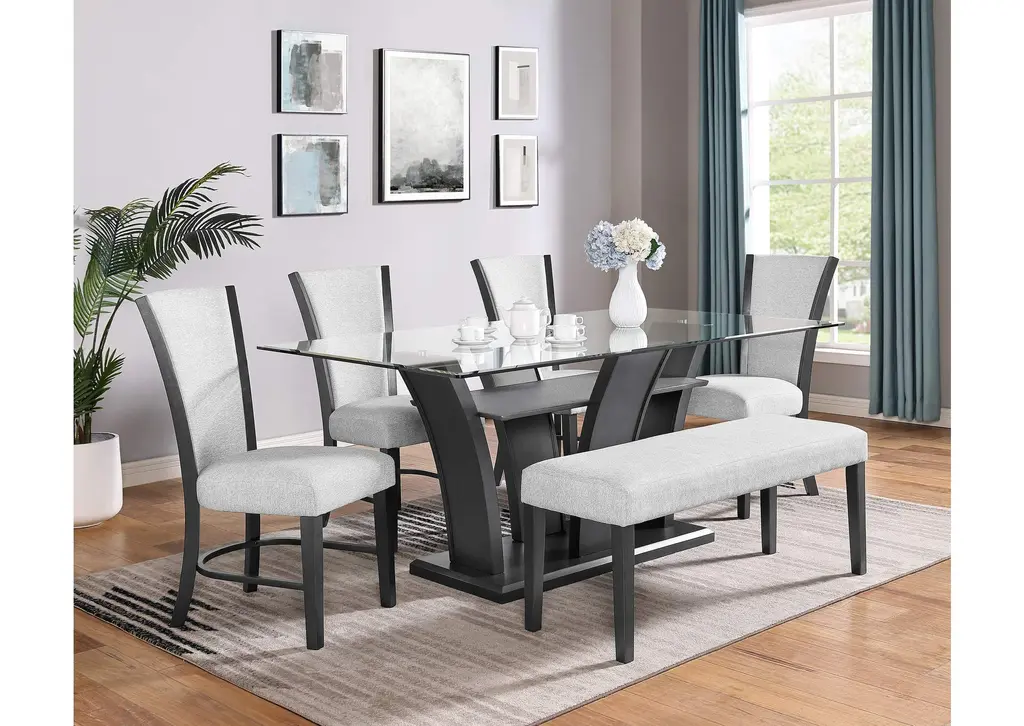 This sleek and modern dining group bridges form and function. The sculptural dining table has a sturdy base and the glass top allows views of the upholstered open shelf. Streamlined chairs and bench feature pewter finished wood and dove gray upholstery for contrast. Weight 27.500 lbs. (12.38kgs.)