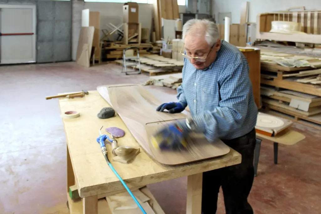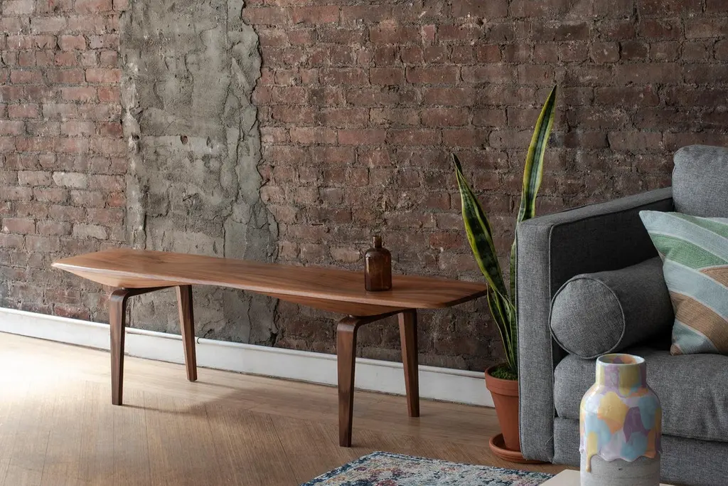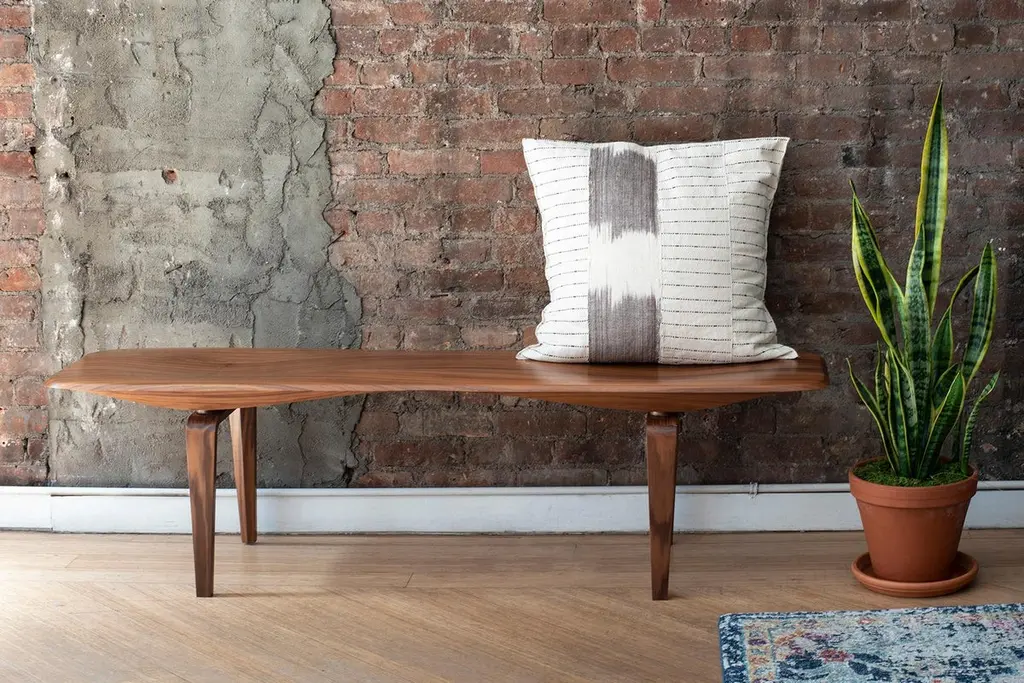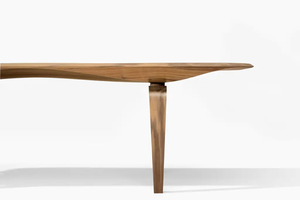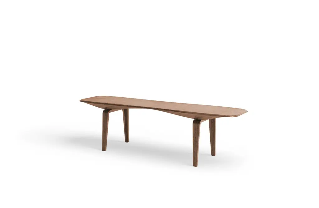 A sculptural wood bench at the intersection of functional art and furniture. KG bench merges mannerism with engineering. Carved out of the finest solid Noce Canaletto (Black Walnut), this bench merges visual lightness with solidity. In a continuous swoop, the sinuous arched profile goes from mysteriously thin to substantial. The material has a beautiful straight grain and a light brown color emphasizing the unique geometry of the piece. KGB comes in two versions: the one depicted in this listing has a flat top, ideal for using the surface as a low table but it's also available with a carved top version, which invites seating. Named 2018 Best of Year Awards Finalist by Interior Design Magazine.Designed in Brooklyn by Italian-born architect Ale Preda for Miduny, this artisanal product is made in Italy by master craftsmen. A thick slab of solid Black Walnut made from 3 full-length boards is carved for several hours on a 5-axis CNC machine, hand-sanded, stained, and finished with a slightly reflective gloss. The legs follow a similar workflow. The overall process takes no less than 25 steps. Each bench features a hand-stamped unique serial number and comes with a signed certificate of authenticity. As with all our products, the KG bench is designed to ship flat inside a custom-built box and minimal assembly is required. This allows shipping to be more efficient and sustainable. Each of the two legs fits into a carved slot and is attached with two countersunk bolts.