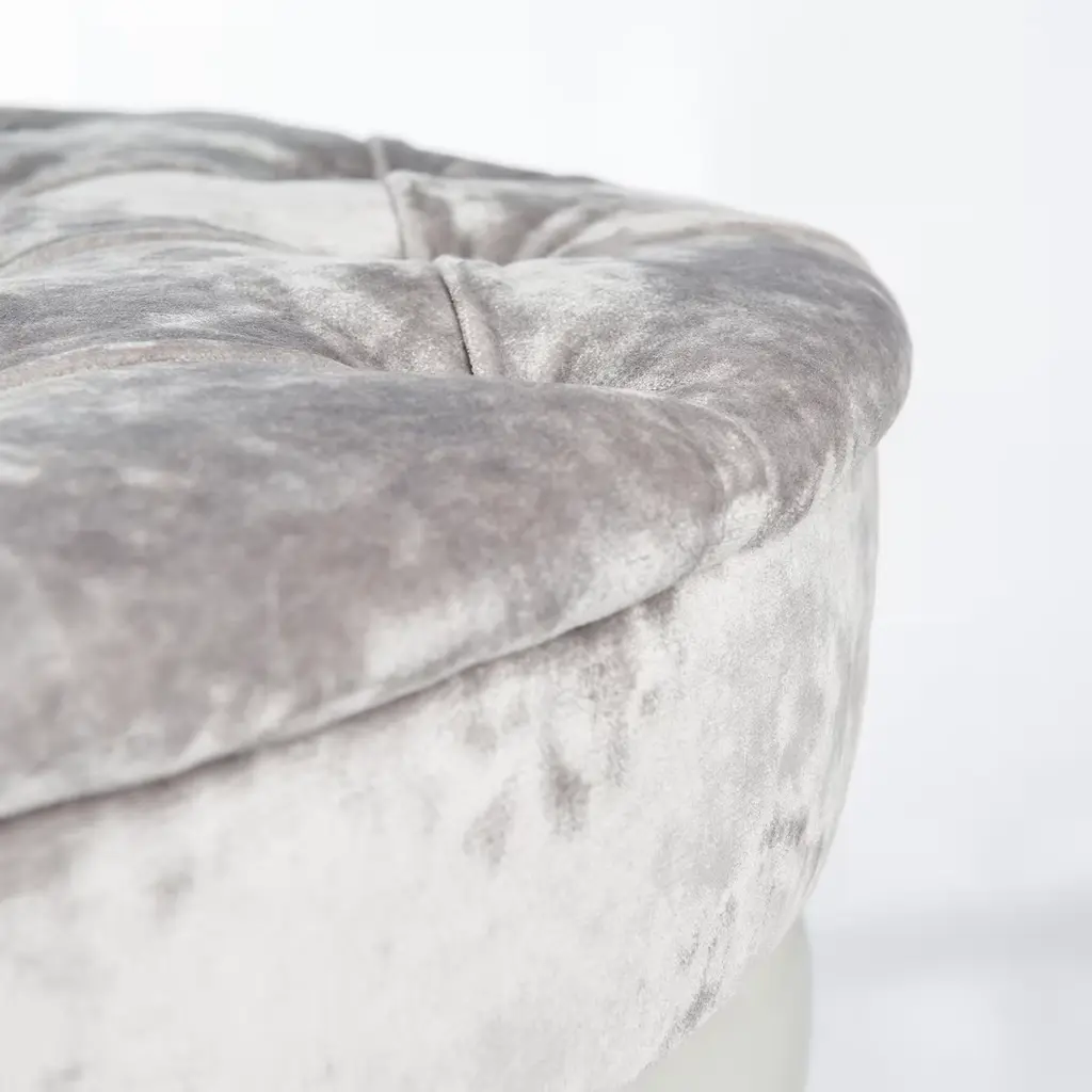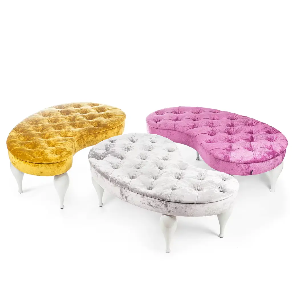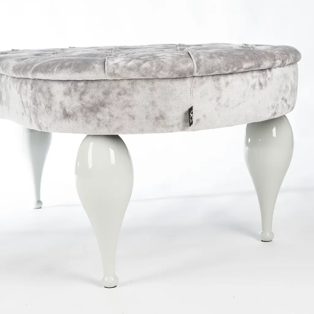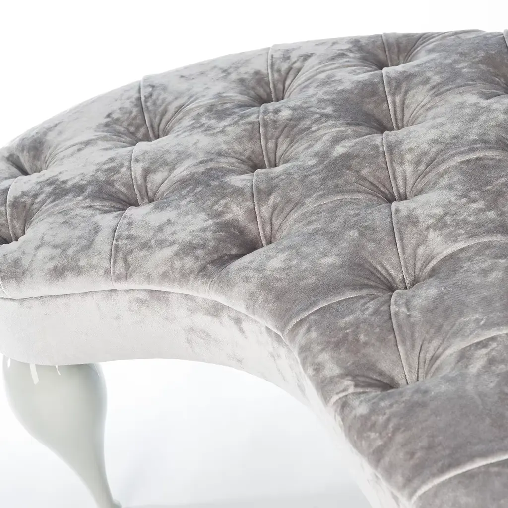 This glamorous bench owes its intriguing character to the coexistence of classic and modern references. Raised on skittle-like legs in white-lacquered solid wood, the bean-like seat feature a plywood frame richly padded with open-cell, multi-density expanded polyurethane, covered with Dacron, and finally upholstered in gray velvet. A splendid capitonne tufting adorns the seat, completing the piece.
