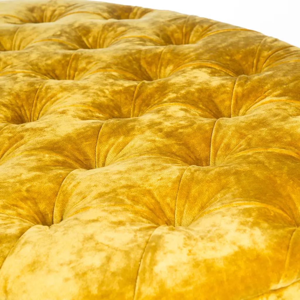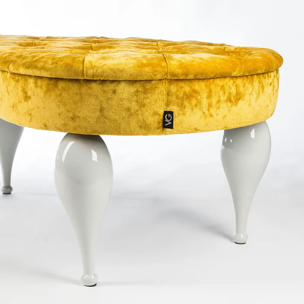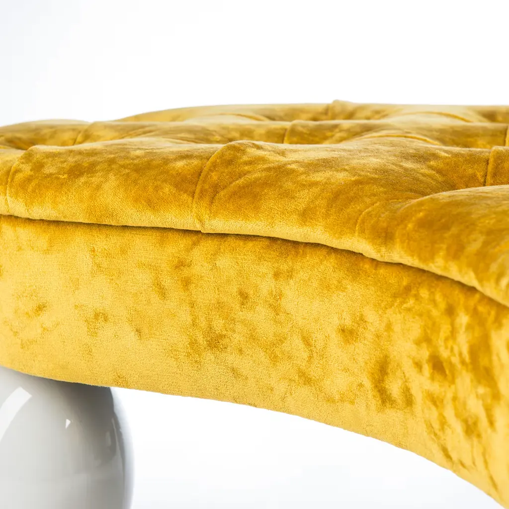 A daring combination of hues coupled with classic-style references lends this bench its unmistakable eclectic charm. The skittle-like legs in white-lacquered solid wood offer impeccable support to the bean-like seat, whose plywood structure is combined with a generous open-cell, expanded polyurethane padding completed by Dacron lining and tufted yellow velvet upholstery.
