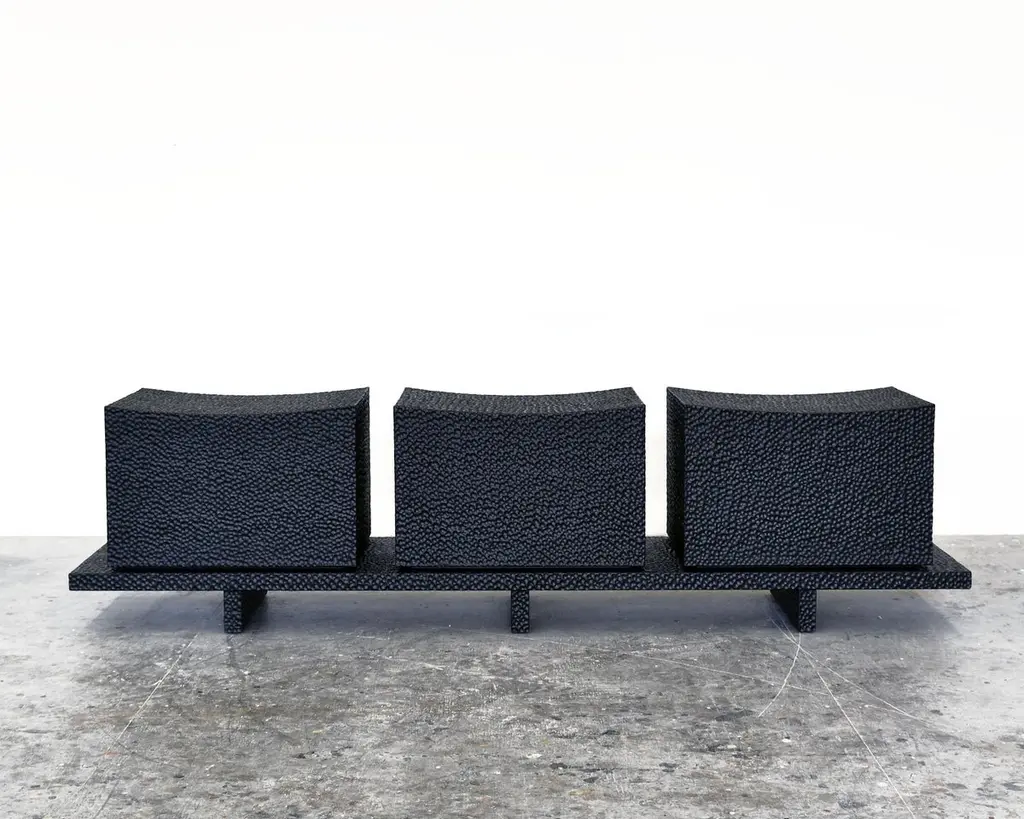 Carved and Black Oak T5 Bench by John Eric ByersDimensions: W 142 x D 51 x H 36 cm.Materials: Carved, Blackened, White oak.John Eric Byers creates geometrically inspired pieces that are minimal, emotional, and modernly refined.John's individually handmade work is guided by purity in form, surface texture, structure, and respect for use of materials. Heralded as a leading American artist working in wood, permanent collections include the Smithsonian American Art Museum, the Philadelphia Museum of Art and the Museum of Arts and Design in NYC. Numerous awards include a Louis Comfort Tiffany Foundation Award, New York Foundation of the Arts Awards, and inclusion in the Smithsonian's Oral Archives of American Arts.