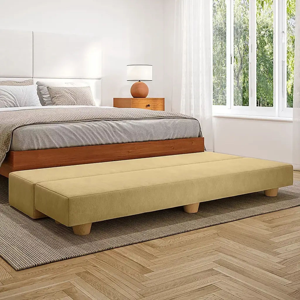 A practical solution for any space, the Casila Modular Bed Bench lets you enjoy effortless transformations that can take you from sitting to sleeping in an instant. Regardless of where you decide is the perfect place for this bench, you will thoroughly enjoy its space saving capabilities. Constructed from a pair of foam platforms, the Casila acts as a slender end of bed bench that also doubles as a twin sleeper when the platforms are placed side-by-side. The design is elevated with lathe-turned solid maple feet that can be secured in a matter of seconds with its easy-to-unfold wooden base. We paired the bed bench with a fashionable, high-performance micro-velvet fabric with textured striations. Underneath our washable covers are layers of body conforming high-density polyurethane foam covered with lighter foam padding. Feature the bench in front of your king or queen bed to complete any look. Its lightweight and easy to move into the living room for extra seating. Customer assembly is required.