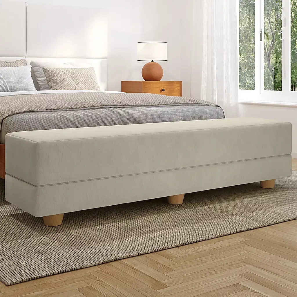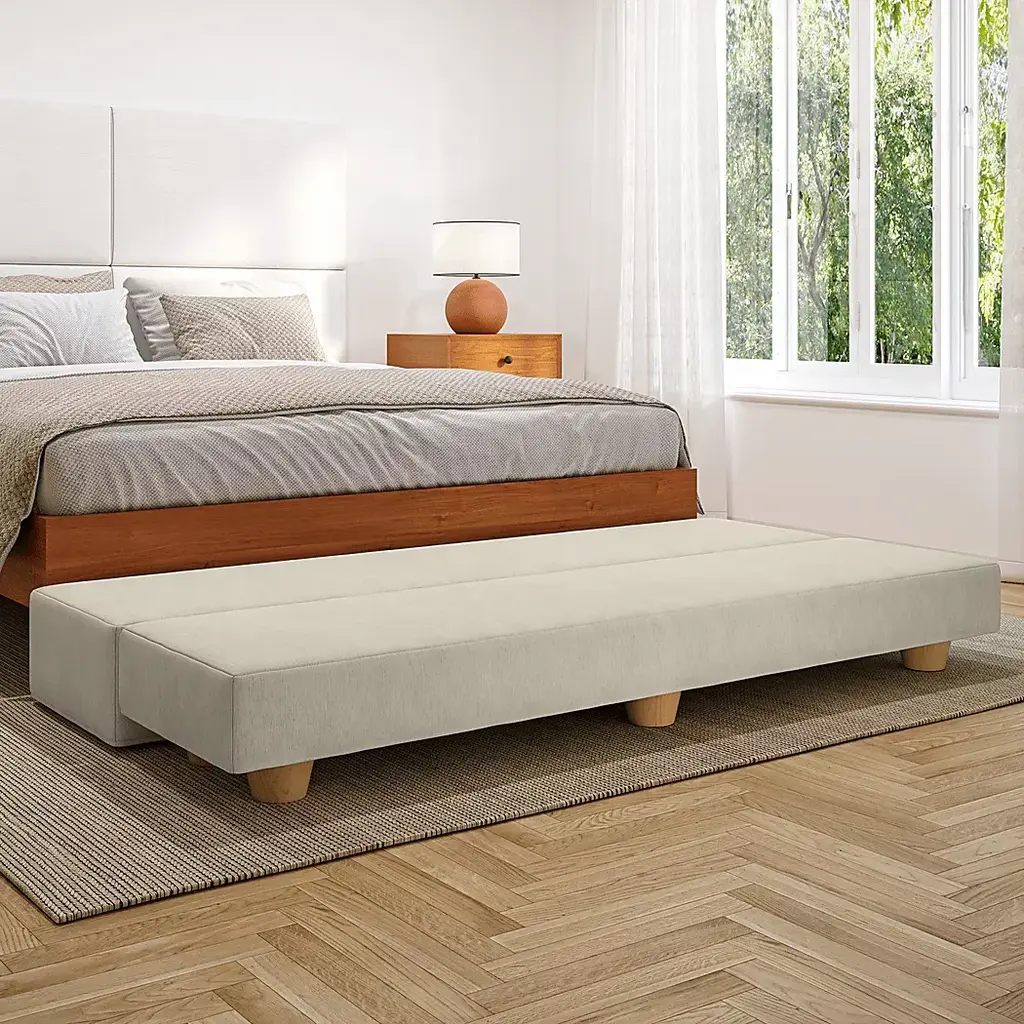 A practical solution for any space, the Casila Modular Bed Bench lets you enjoy effortless transformations that can take you from sitting to sleeping in an instant. Regardless of where you decide is the perfect place for this bench, you will thoroughly enjoy its space saving capabilities. Constructed from a pair of foam platforms, the Casila acts as a slender end of bed bench that also doubles as a twin sleeper when the platforms are placed side-by-side. The design is elevated with lathe-turned solid maple feet that can be secured in a matter of seconds with its easy-to-unfold wooden base. We paired the bed bench with a fashionable, high-performance micro-velvet fabric with textured striations. Underneath our washable covers are layers of body conforming high-density polyurethane foam covered with lighter foam padding. Feature the bench in front of your king or queen bed to complete any look. Its lightweight and easy to move into the living room for extra seating. Customer assembly is required.