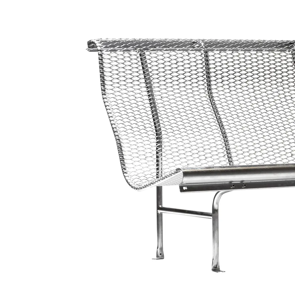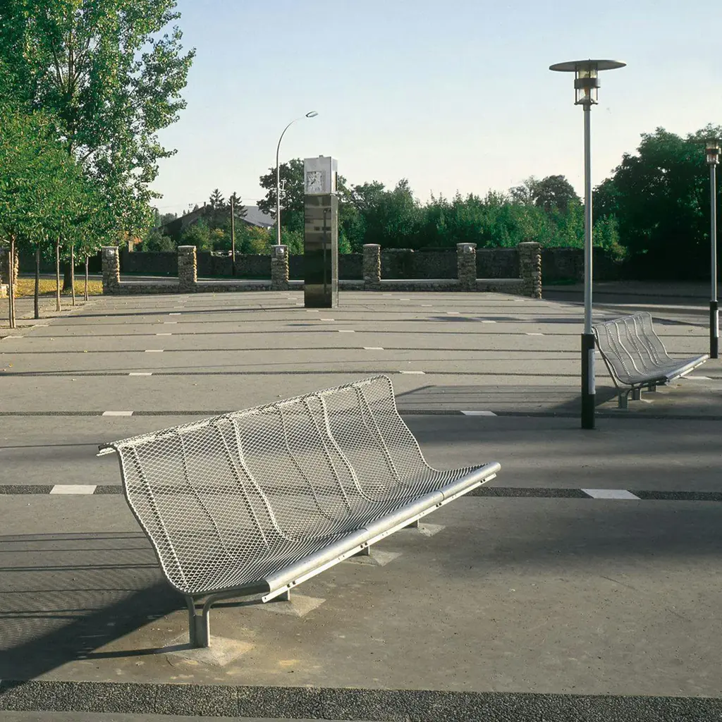 This bench features a perforated steel slatted seat and backrest, providing excellent durability and comfort. The ergonomic shape ensures support during extended use, while the robust material withstands outdoor environments, making it suitable for both public and private spaces. Its understated yet impactful design makes it adaptable to diverse settings, blending functionality and character seamlessly.