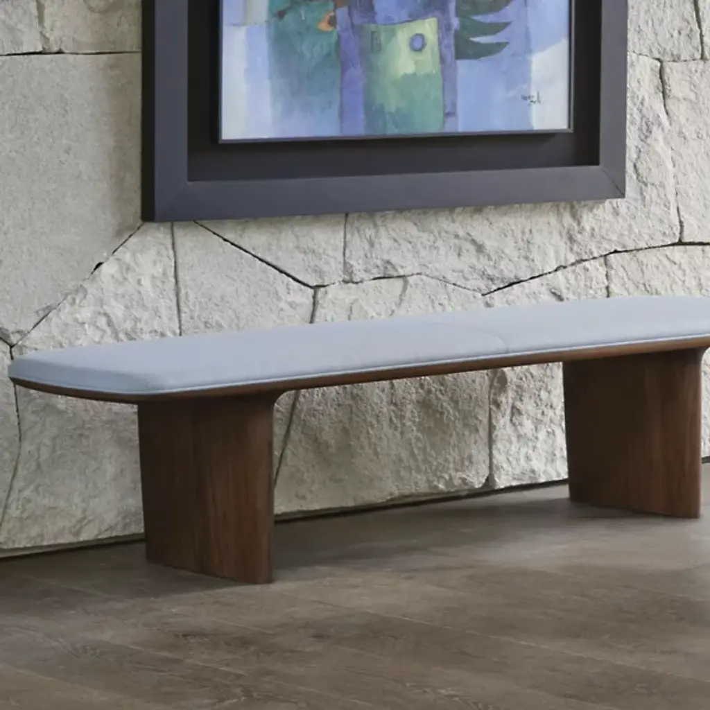 The Catia Bench from Bernhardt Design brings refinement to seating through its elliptical base combined with gently curved proportions. Light and airy in appearance, the piece creates a streamlined profile that elevates the typical bench category. Noé Duchaufour-Lawrance incorporates a substantial upholstered cushion that maintains clean lines throughout the design. Welting traces the seat perimeter while saddle stitching through the center adds structural detailing. The American walnut frame provides natural warmth and grain patterns that complement the upholstered elements, resulting in furniture that balances sophistication with functional versatility.