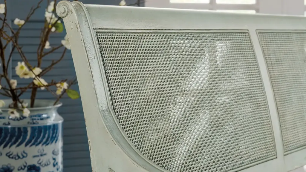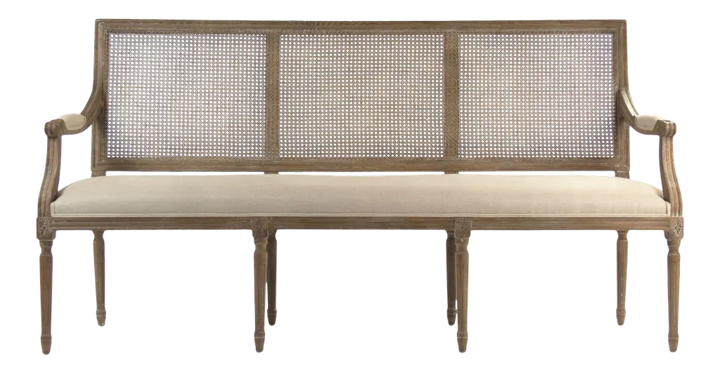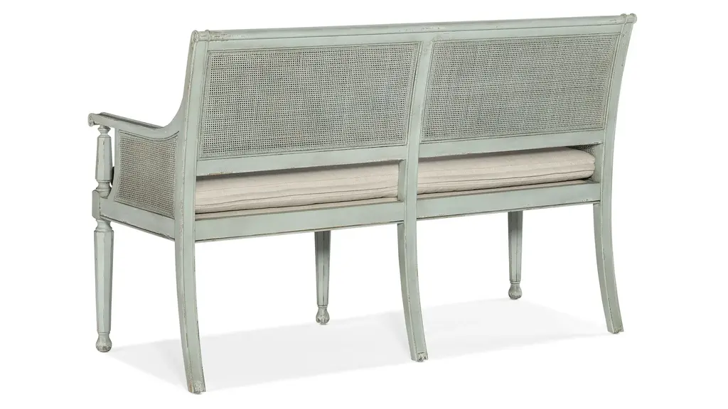 A fresh take on vintage design, the charming Charleston Bench is crafted of wood and accented by cane on the back and inside and outside arms. Featuring intricately-shaped legs, the piece is finished in Haint Blue, a soft color which can be found on the ceilings of porches and entryways, window shutters and doors in the American South, dating back more than 200 years from the Gullah folklore that held the color kept "haints" or spirits from entering homes and dwellings. The cushion is upholstered in the Oyster performance fabric for stain resistance and cleanability.