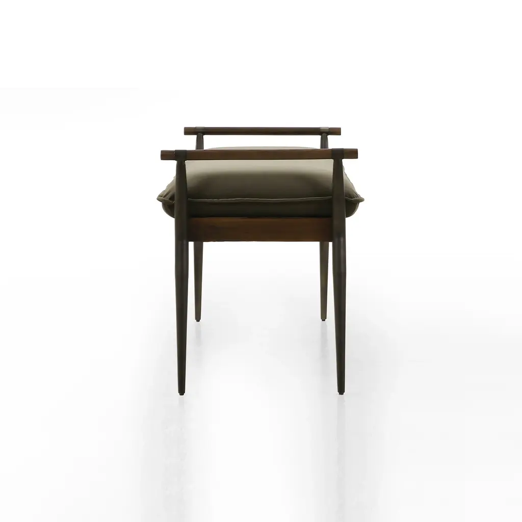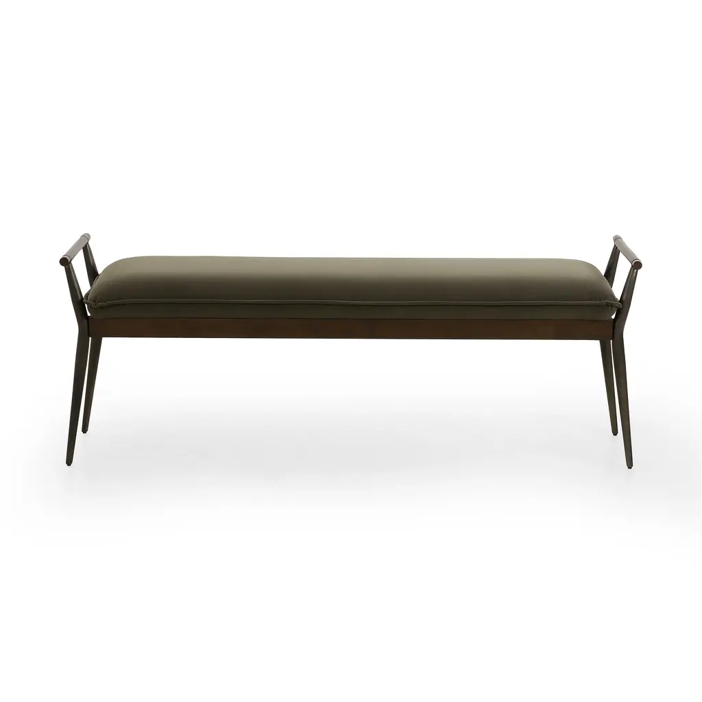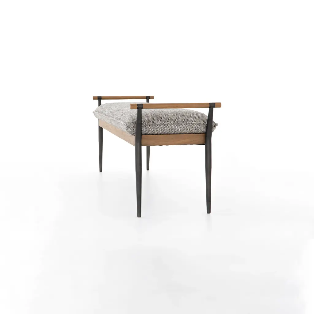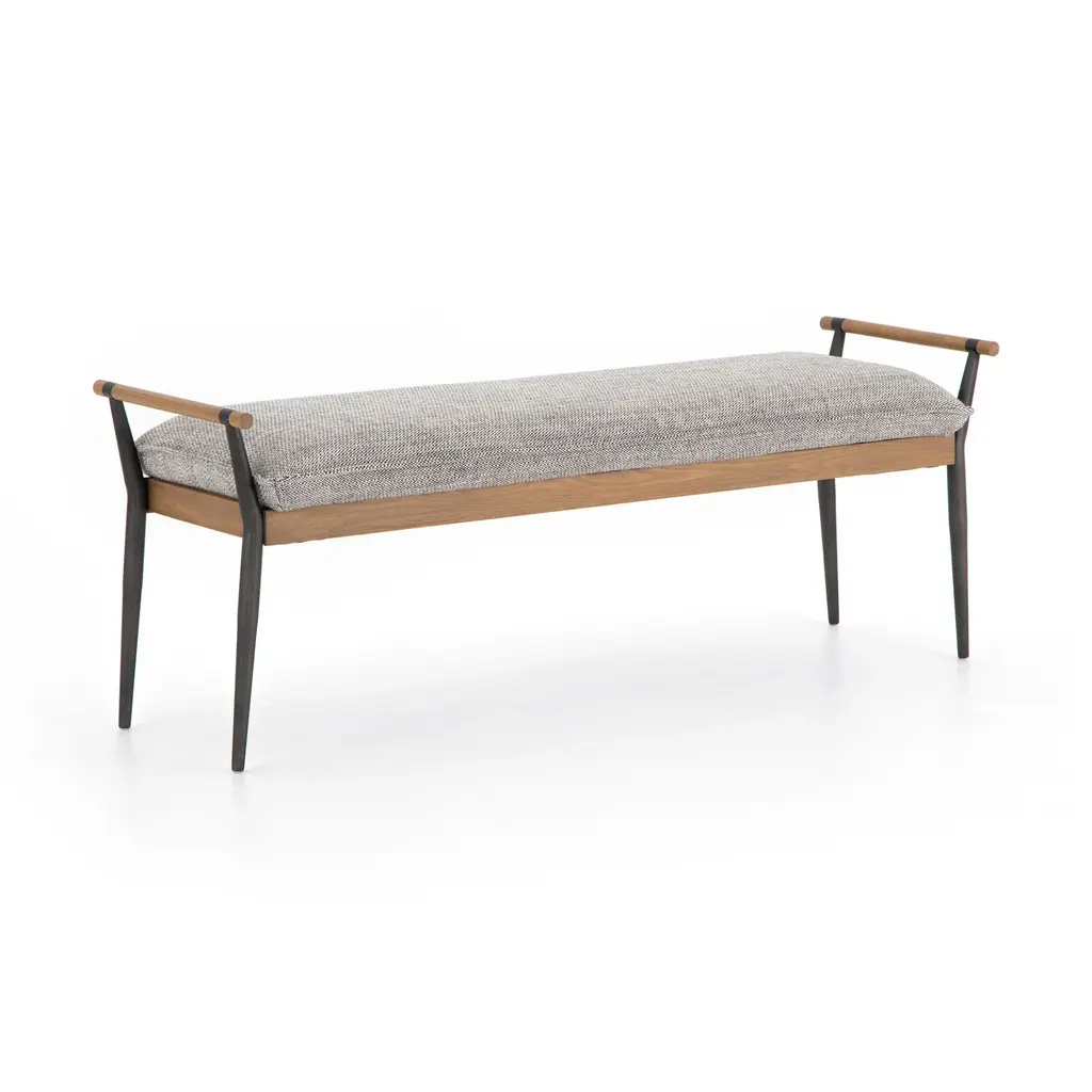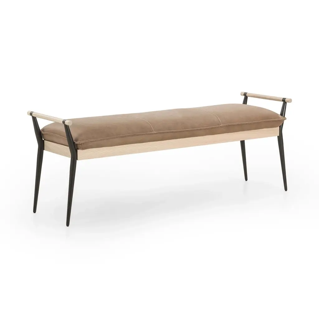 Smart in shape and style. A slim-profile bench inspired by midcentury design features stainless steel framing with solid oak detailing, plus velvety cushioned seating. Ideal in an entryway, living area or at the foot of the bed. Features