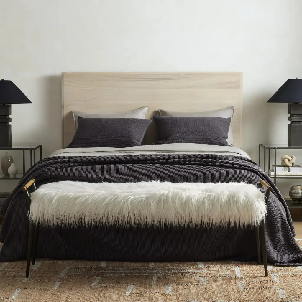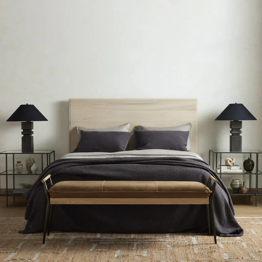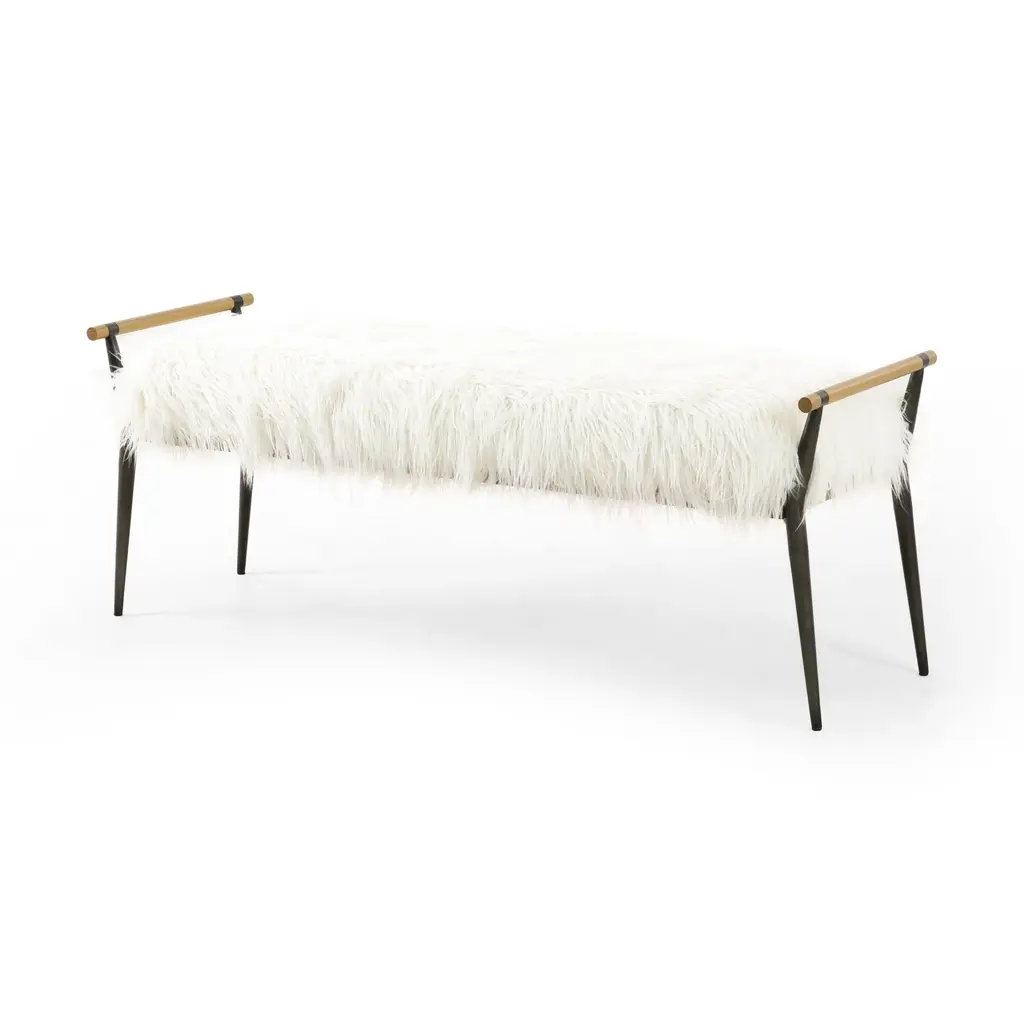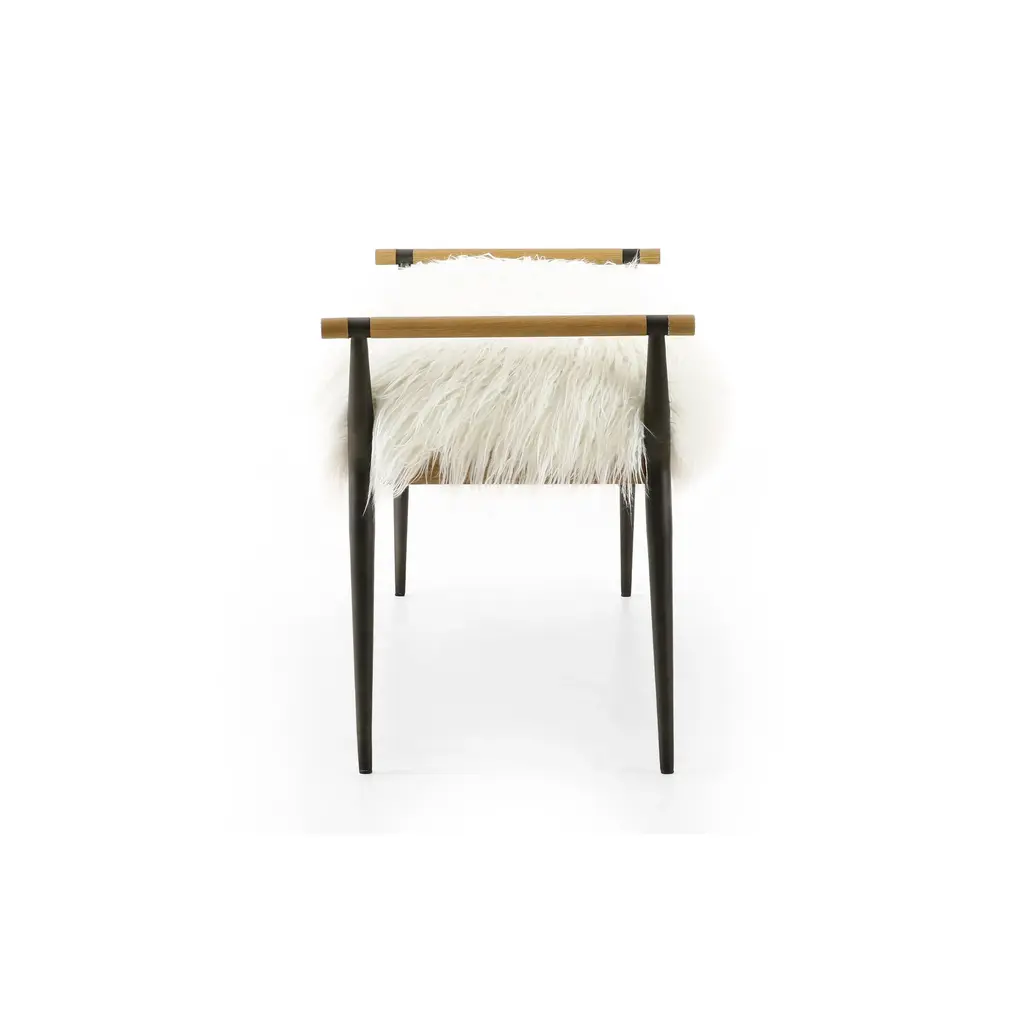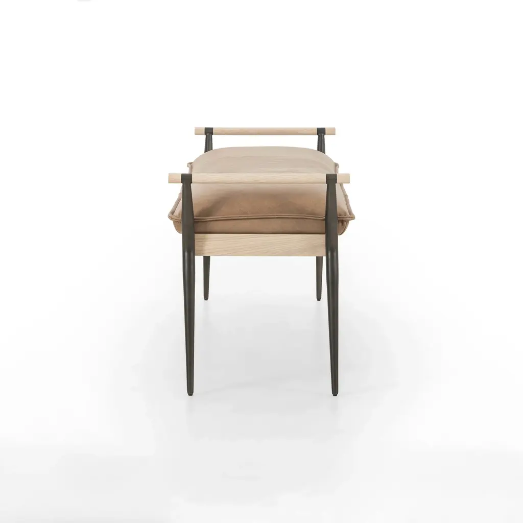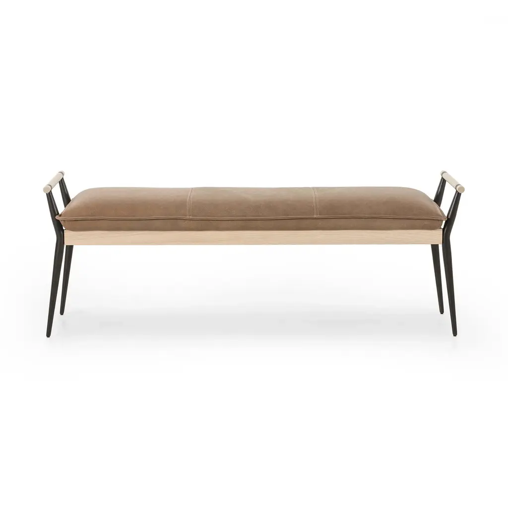 Smart in shape and style. A slim-profile bench inspired by midcentury design features stainless steel framing with solid oak detailing, plus velvety cushioned seating. Ideal in an entryway, living area or at the foot of the bed. Features