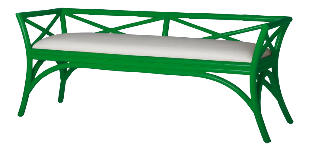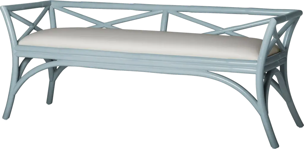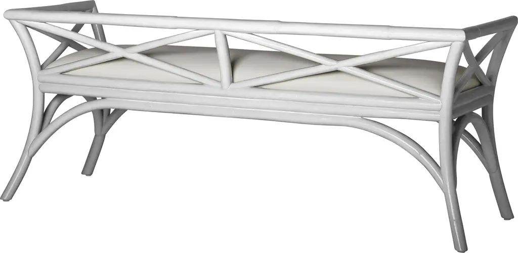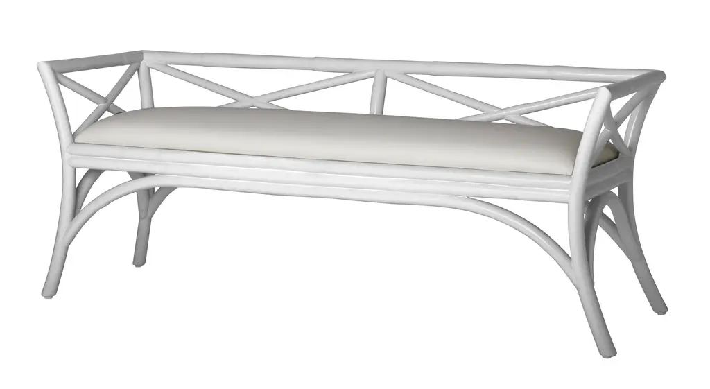 This beautifully designed bench from David Francis features a Rattan frame, mitered corners and a tight seat upholstered in a soft white high performance fabric. Each David Francis bench is hand-finished and upholstered in the USA. Please allow time for delivery