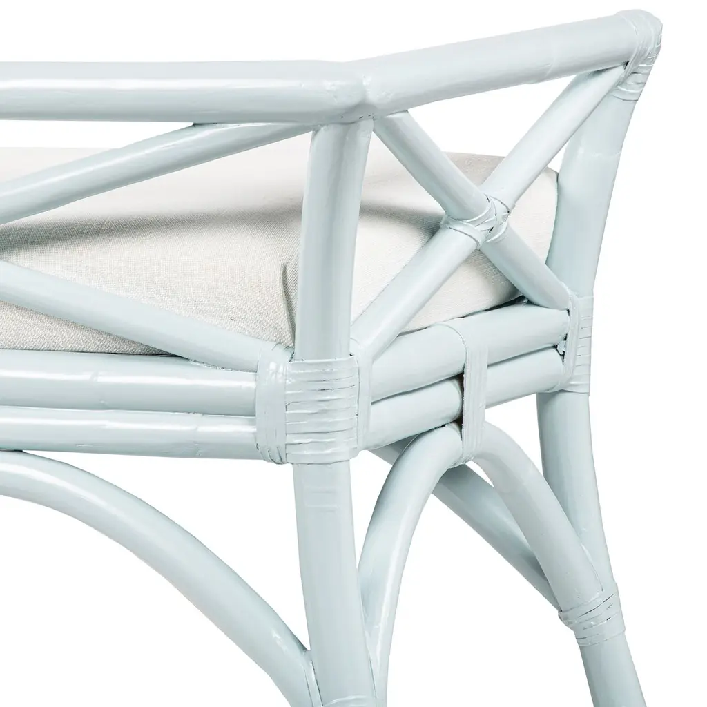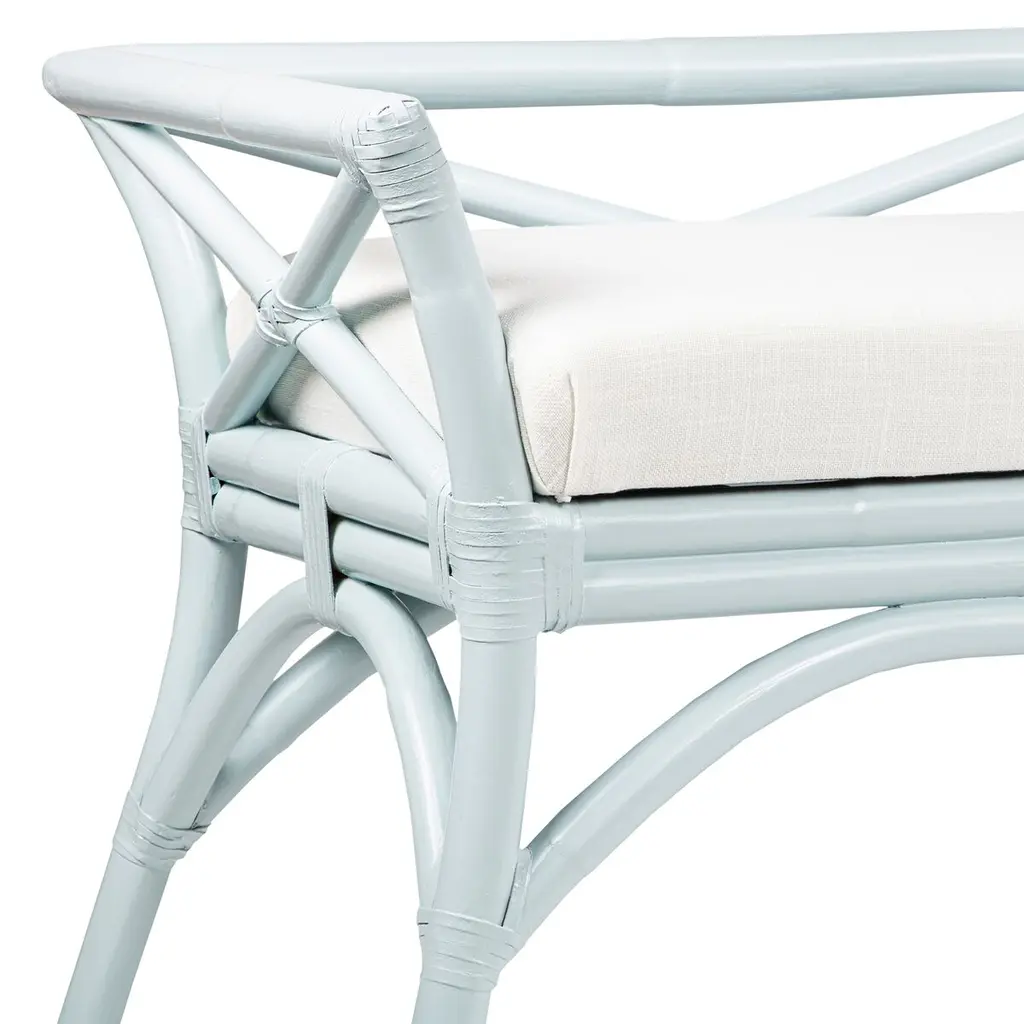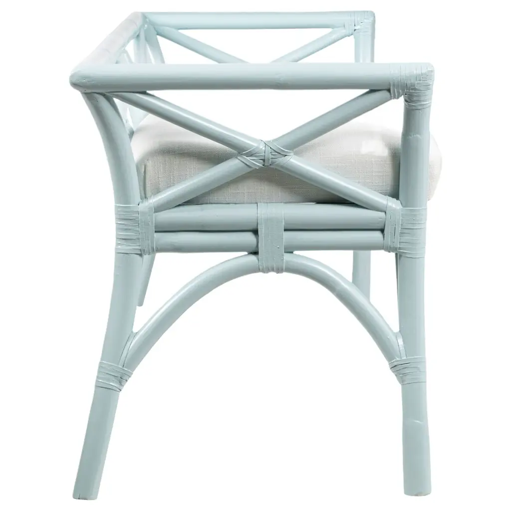 The clean lines of the Charlotte Bench are sure to add elegance to any home. The Charlotte bench is constructed with a Rattan frame and hand-wrapped with leather bindings at all joints. This bench features a tight upholstered seat and is covered in an inside-out performance fabric. The fabric is fade-resistant, bleach-cleanable, soap and water-cleanable, stain-resistant, liquid-resistant, and quick-drying. The furniture frame and cushions are finished and sewn to order at our Florida factory.