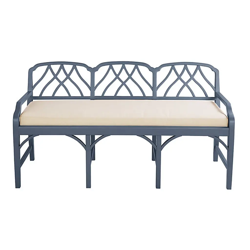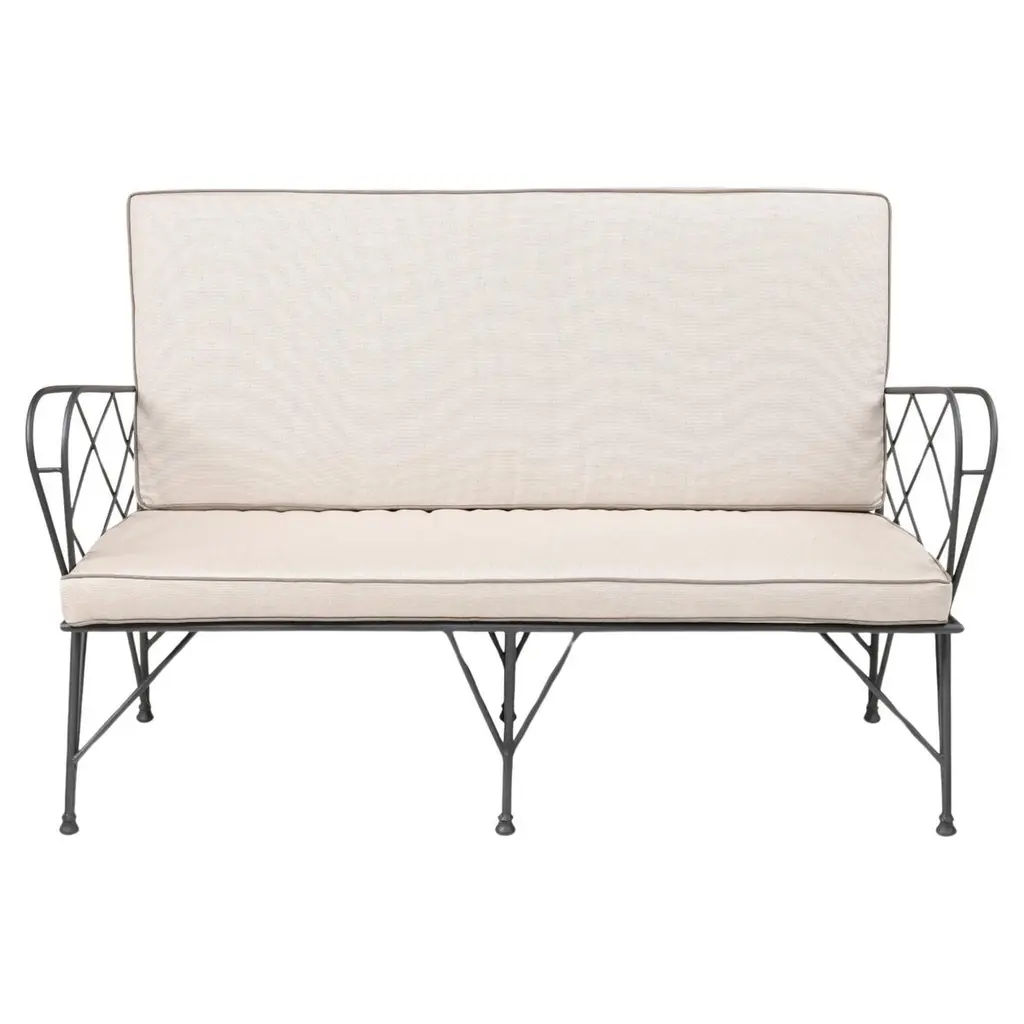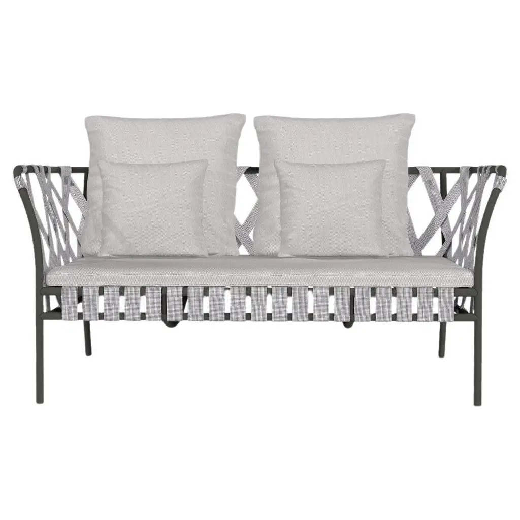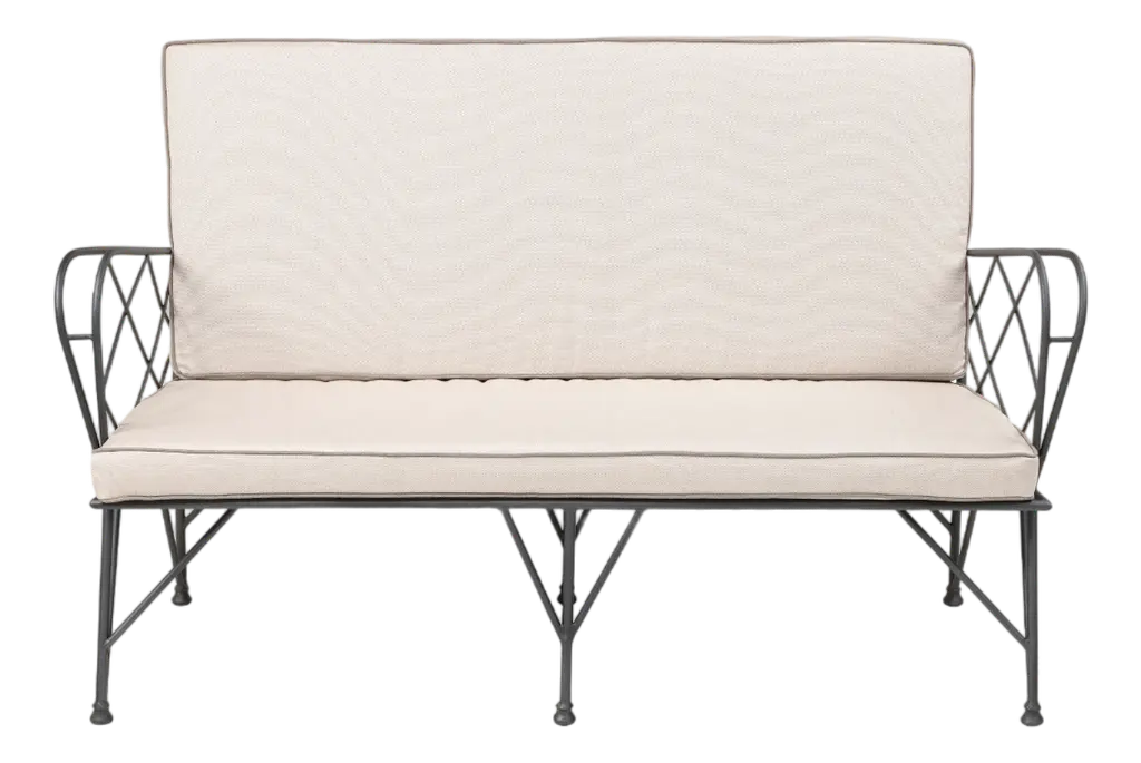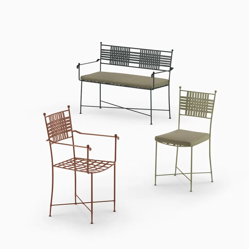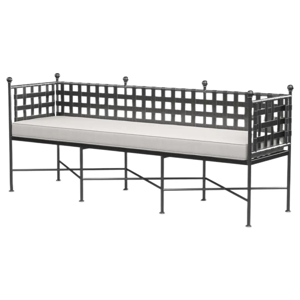 Streamlined profiles accented with spherical finials at some of their extremities trace the graceful silhouette of this bench. Fashioned of galvanized metal and powder-coated in forest green, the structure is distinguished by the backrest's captivating twine, where strips orthogonally intertwine to simultaneously offer optimized support and visual charm. Please contact the Concierge for color variants.