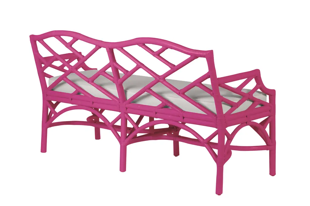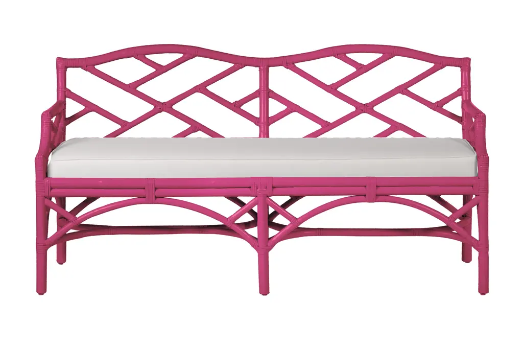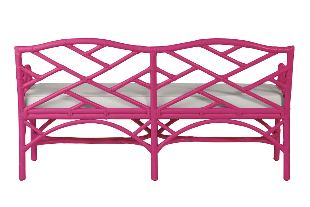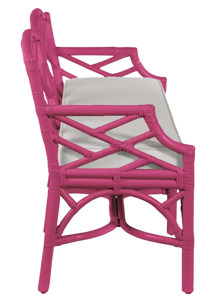 Classic silhouettes are transformed into luxury with this Chinoiserie styled bench. Festuring a Rattan frame, rawhide-wrapped joints and a tight boxed seat upholstered in a soft white high performance fabric. This bench will instantly add character and charm to any indoor space. Each bench is hand-finished and upholstered in the USA. Please allow time for delivery.