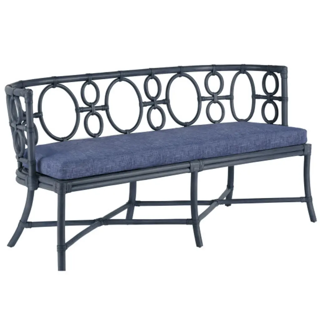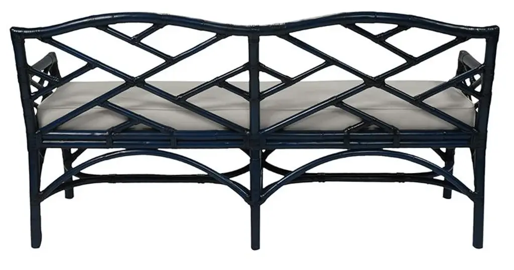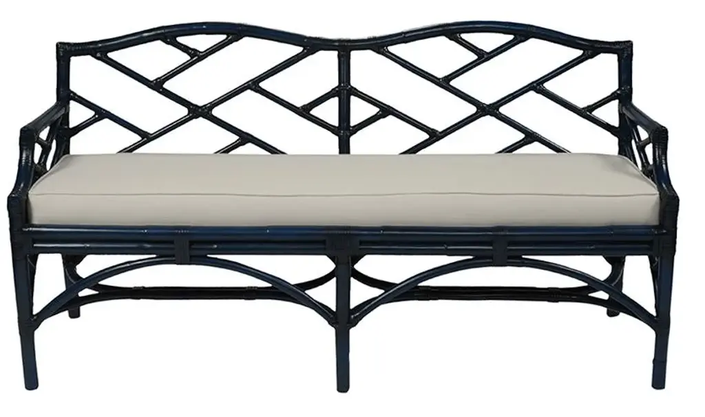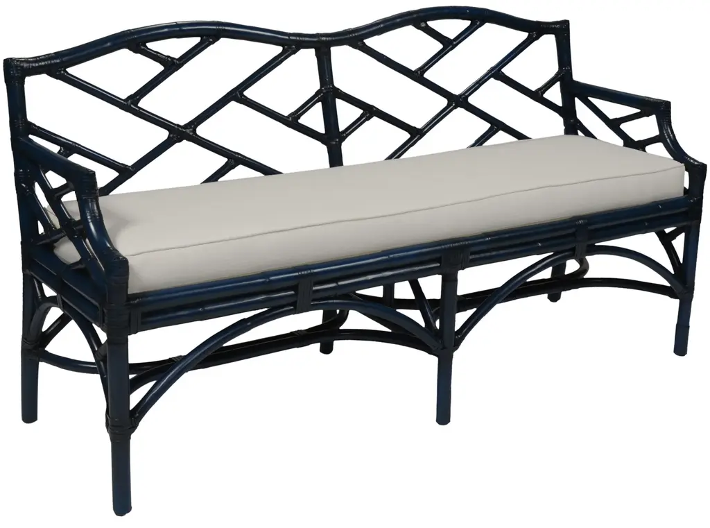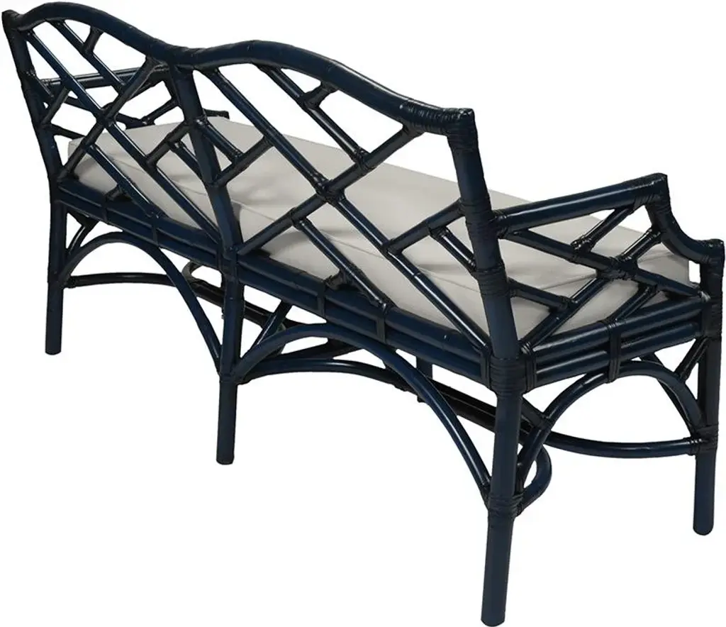 Classic silhouettes are transformed into luxury with this Chinoiserie styled bench. Festuring a Rattan frame, rawhide-wrapped joints and a tight boxed seat upholstered in a soft white high performance fabric. This bench will instantly add character and charm to any indoor space. Each bench is hand-finished and upholstered in the USA. Please allow time for delivery.