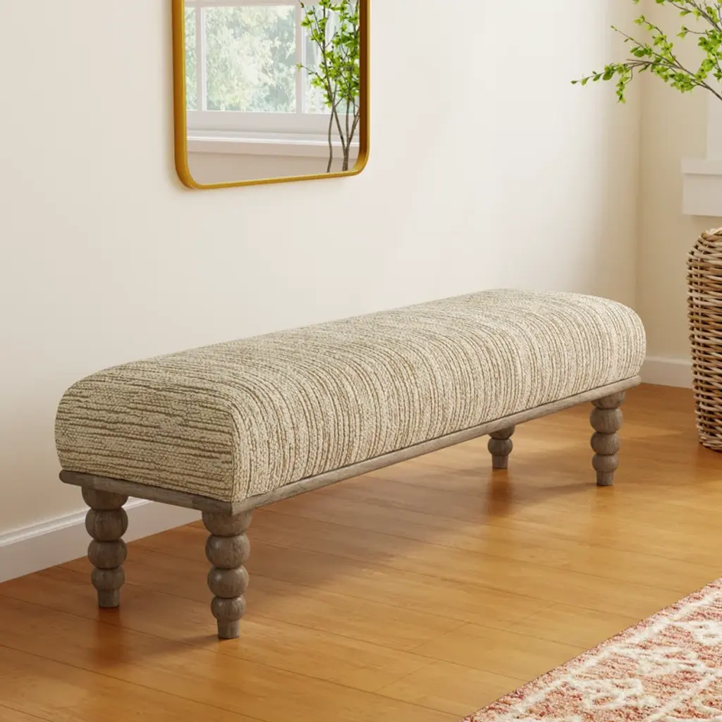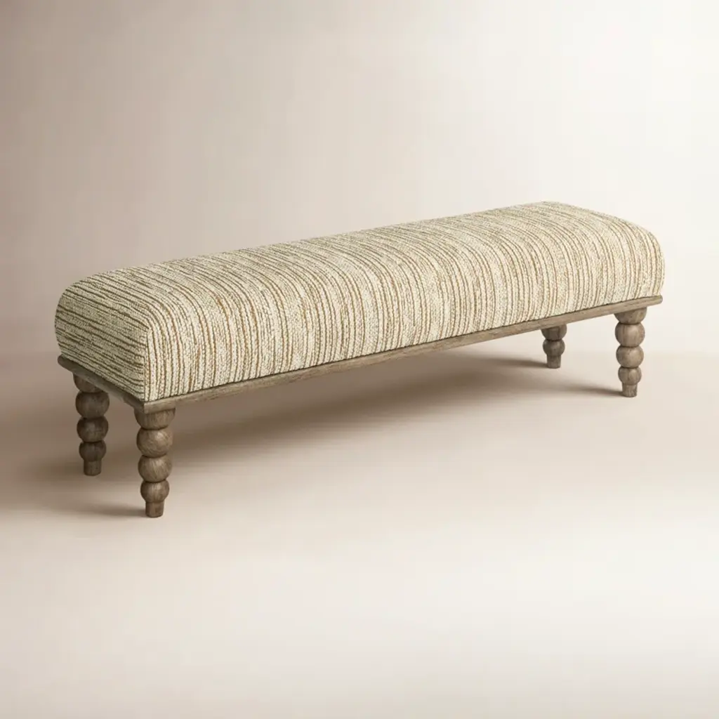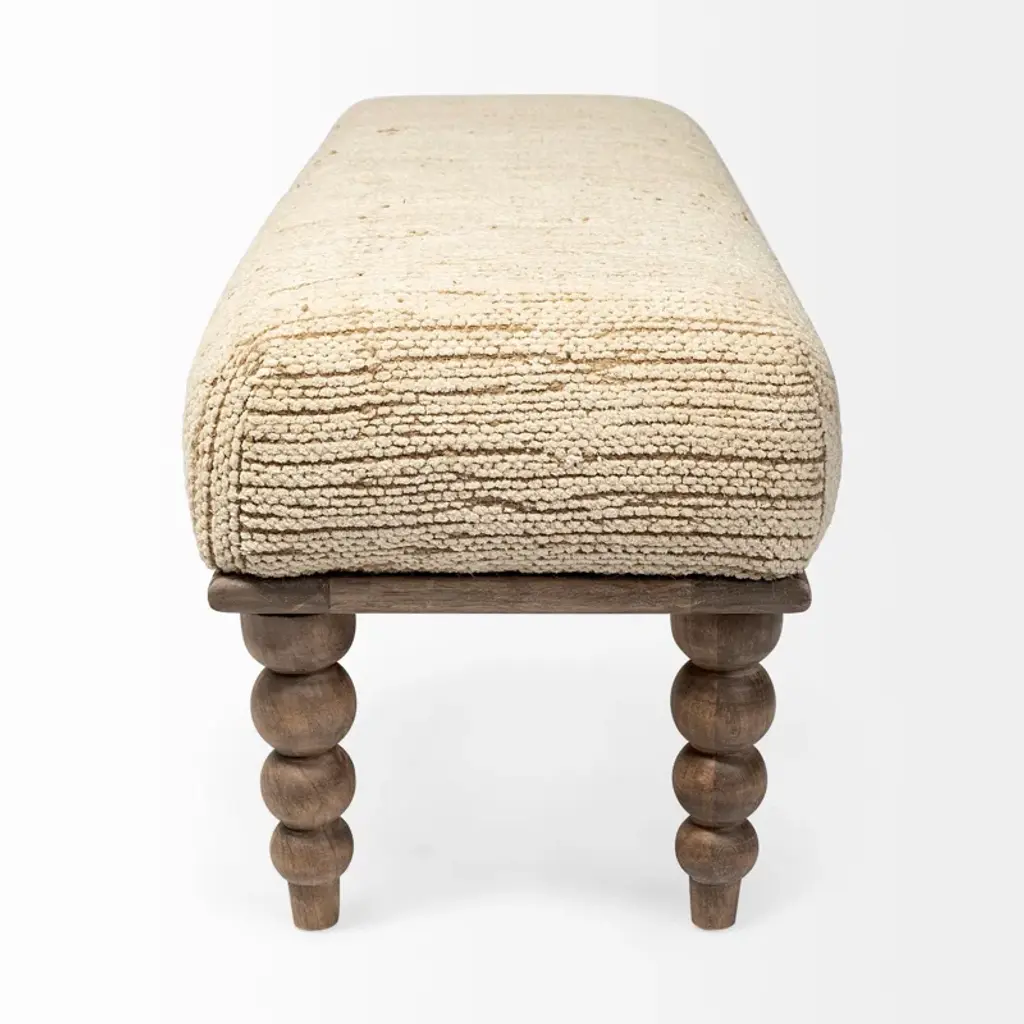Featuring a frame and base crafted from premium Indian mango wood, a spectacular bench that is functional and visually appealing. It flaunts a perfectly stuffed, hand-upholstered top wrapped in plush cream fabric that complements the four natural-brown polished, turned legs that not only add to the visuals of the bench but also contribute to its stability and balance. featuring an elegant design and a neutral color palette, makes for a gorgeous addition to spaces based on the Enduring Elegance and Global Curiosities design styles.