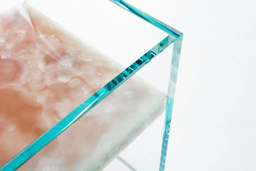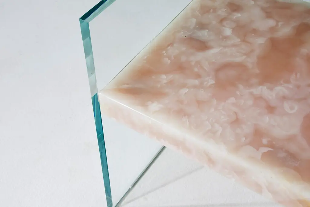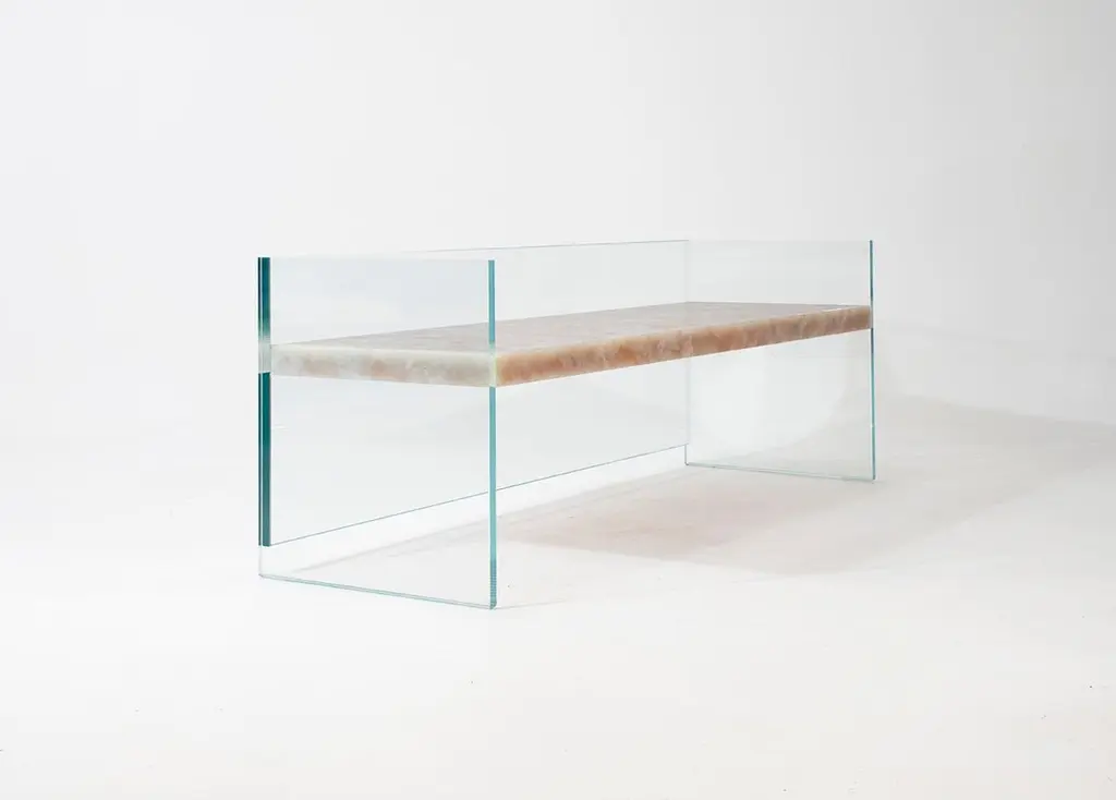 Claste Where We First Met Bench In Ultra Clear Glass With Pink Onyx Marble Slab