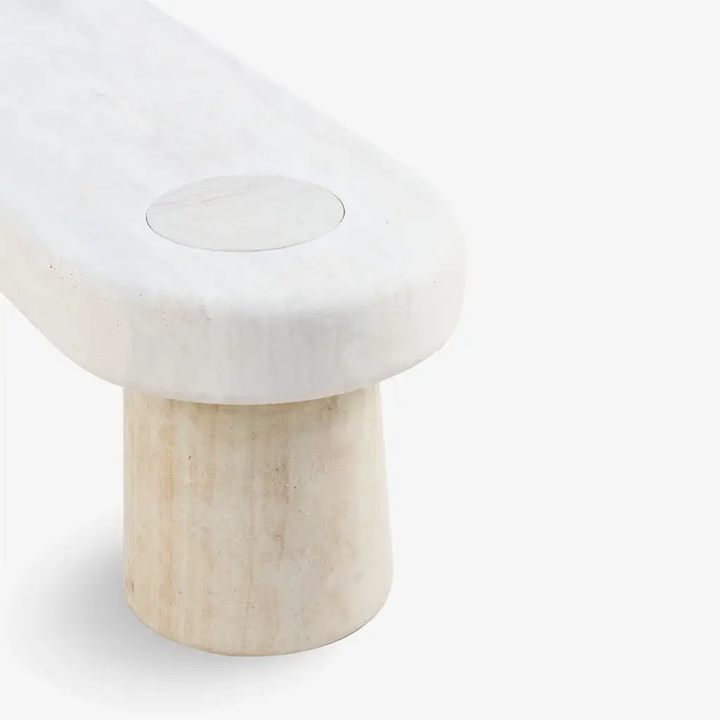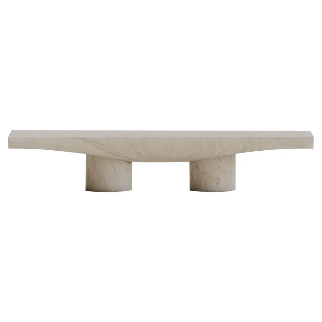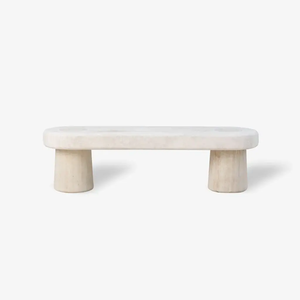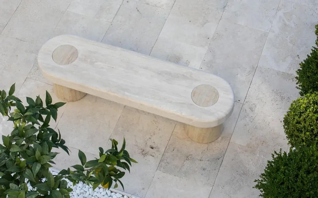 A bench crafted entirely in travertine with two bases in Pietra Dorata, Clio boasts an essential and ultra-modern design. geometric and linear, with softened corners for a refined and minimalistic effect, it seamlessly integrates into spaces with a more contemporary flair.Natural stone bench available in Travertine, cut and shaped using CNC machines, consisting of a seat that fits onto two cylindrical bases made of Pietra Dorata measuring 45 cm x 30 cm.