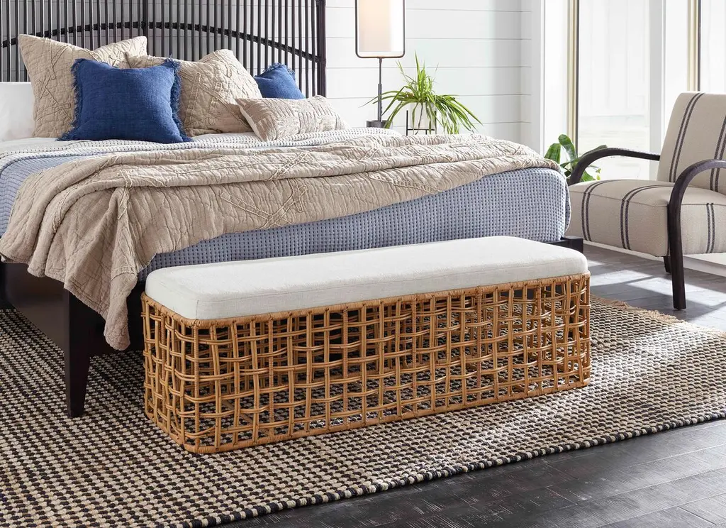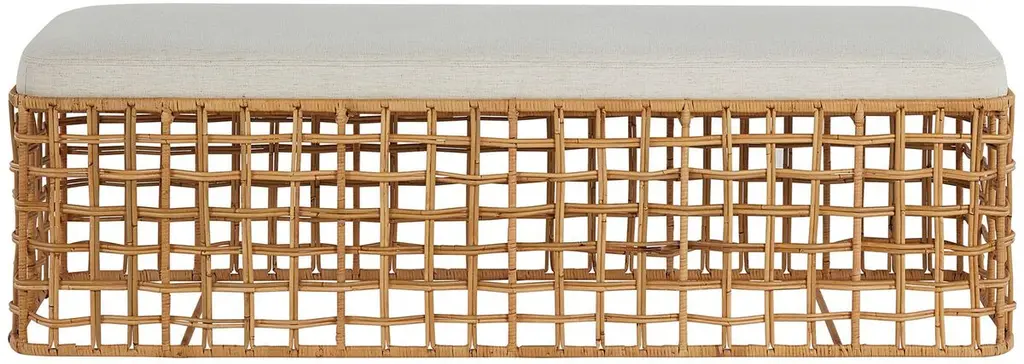 Bring a touch of the tropics to the foot of your bed, your entryway, or beneath your living room window with this airy rattan bench. The cushion is upholstered with stain-resistant, easy-to-clean performance fabric, making the bench well suited for households with kids, pets, or spill-prone adults.