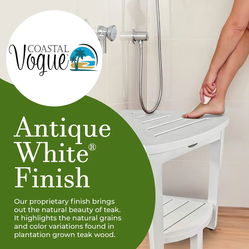 The CoastalVogue Compact Solid Teak Corner Shower & Shaving Bench in a Coastal DriftWood Finish is the perfect solution for those who want maximum seating and storage in minimal space. The bench has a unique curvature comfort edge seat, which provides comfortable rounded corners that won't cut into your skin. The CoastalVogue finish is inspired by the earth tones of naturally aged DriftWood and adds a coastal theme that will complement any bathroom decor. The bench is fully functional and can support up to 250 pounds of weight. The shelf provides ample storage space for all your toiletries and essentials. The stool is 18" off the ground, making it a comfortable height for both sitting and using as a footrest while shaving.Features:Other sections:
