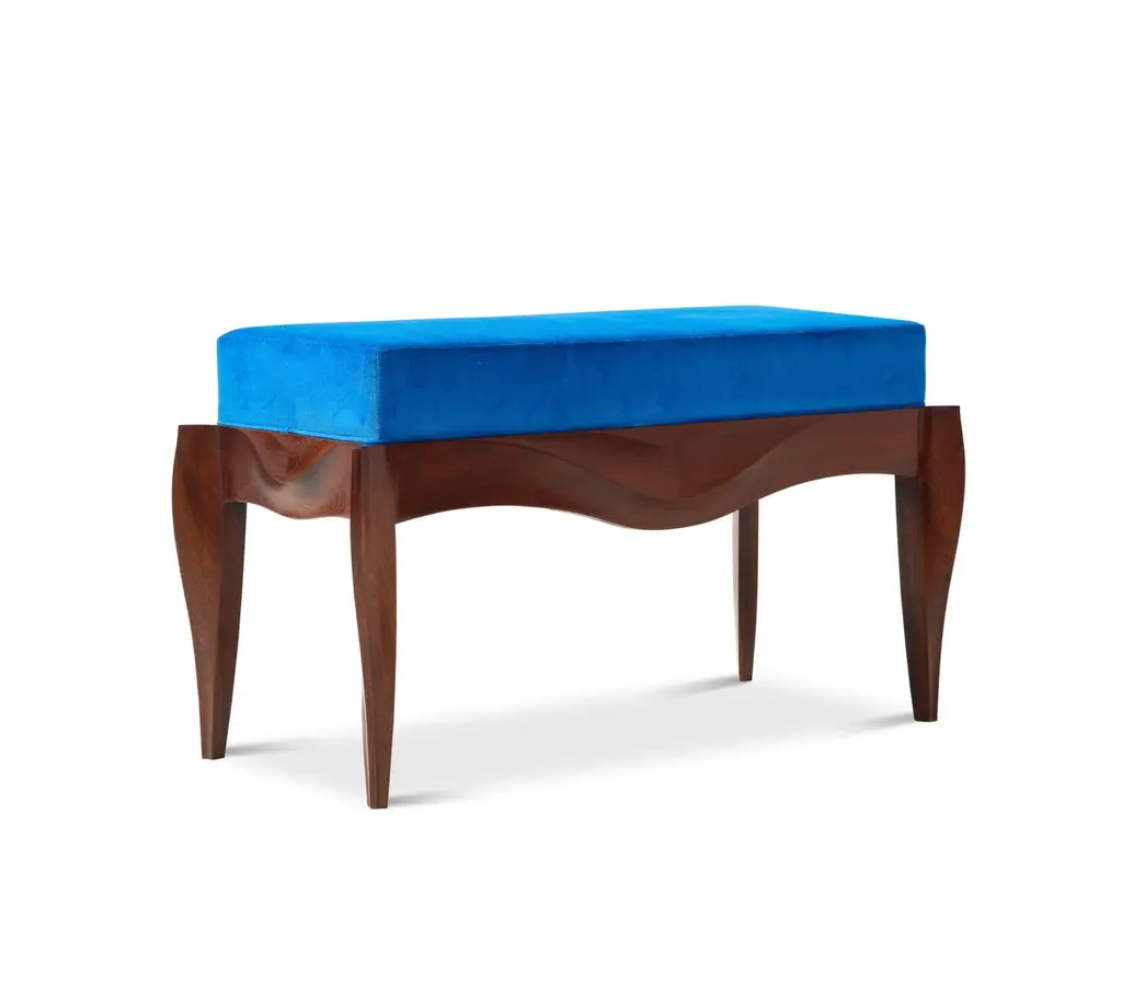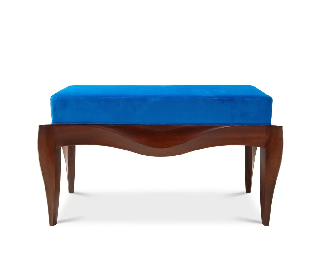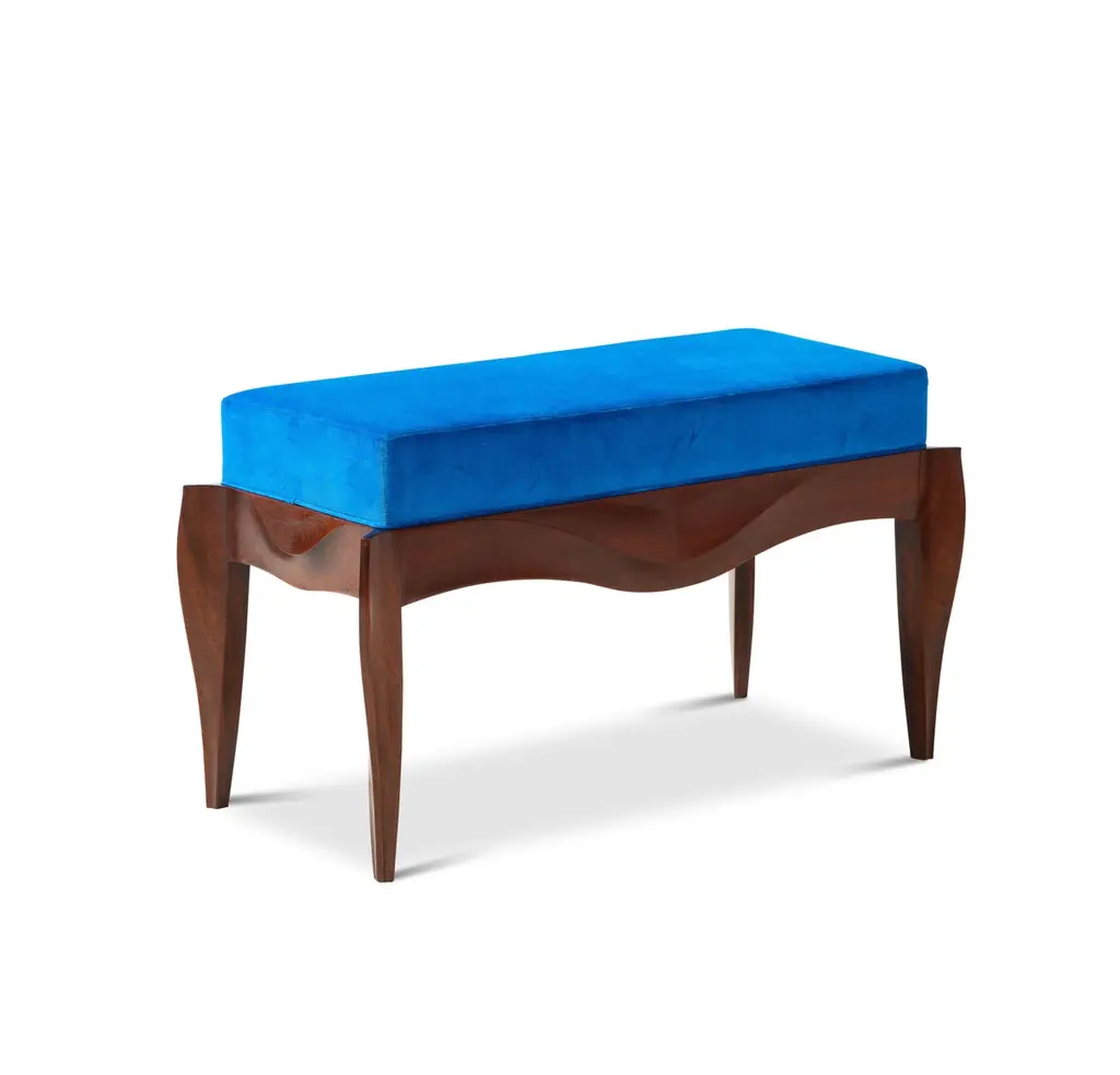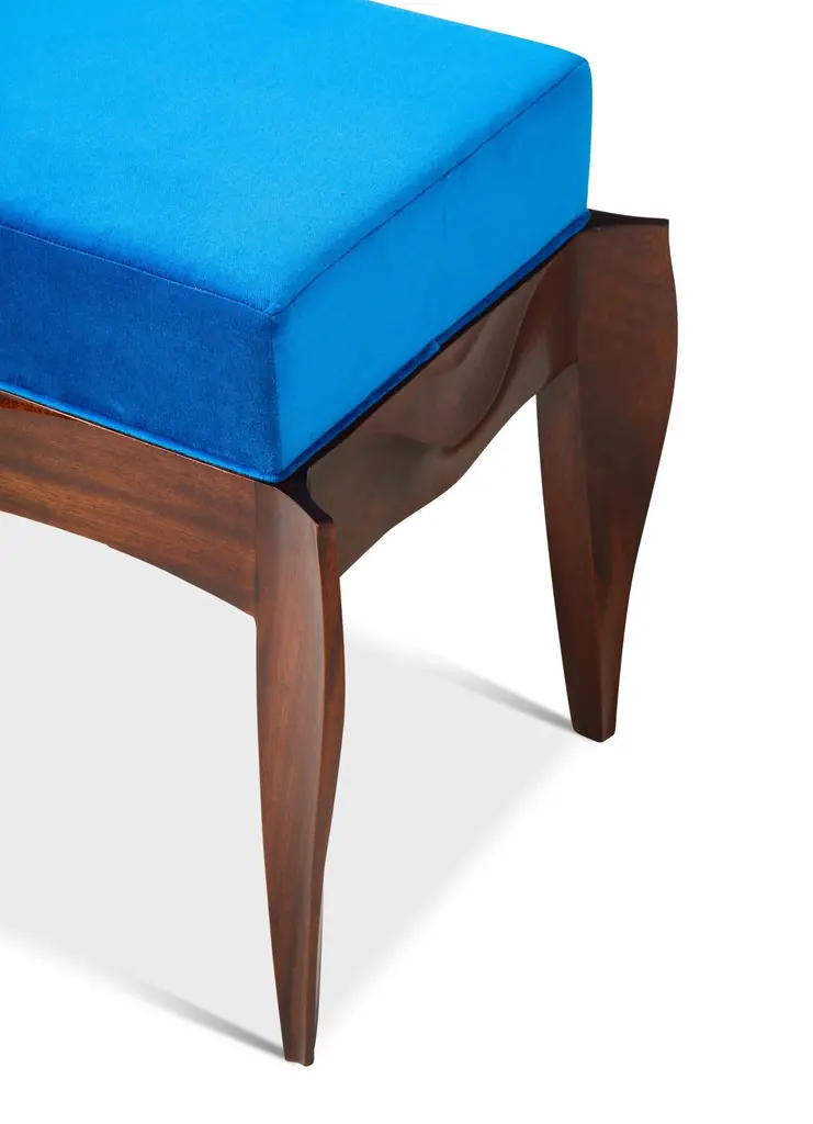 Colette's design was inspired by Emile-Jacques Ruhlmann's classic work desk and realized with contemporary techniques. Convex curvatures with constantly changing radius express structural clarity of the shape, guiding the eye along the lines of the bench while allowing for a smooth flowing transition between vertical sculptural elements and horizontal shapes. Colette series blends references to the history of art and design with contemporary aesthetics of private and social spaces.Walnut, mahogany, and other exotic woods are used for fabrication. The bench will be custom made to an order, giving a customer options to pick wood and fabric that reflect their personal style and match the existing interiors.