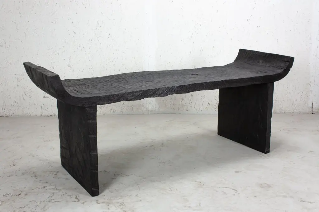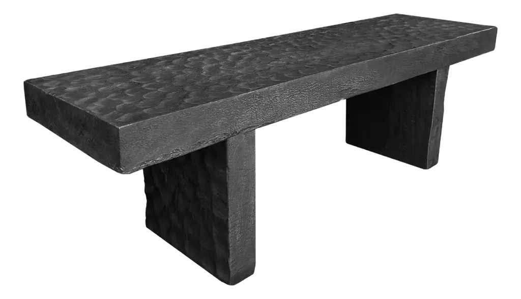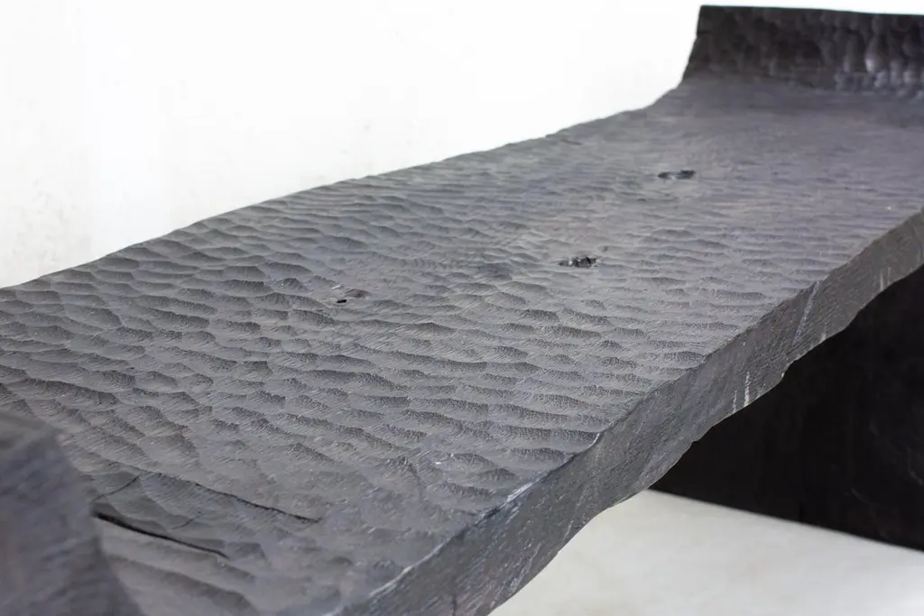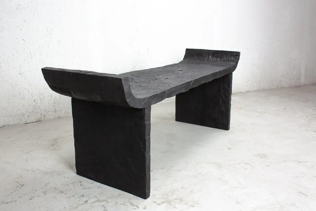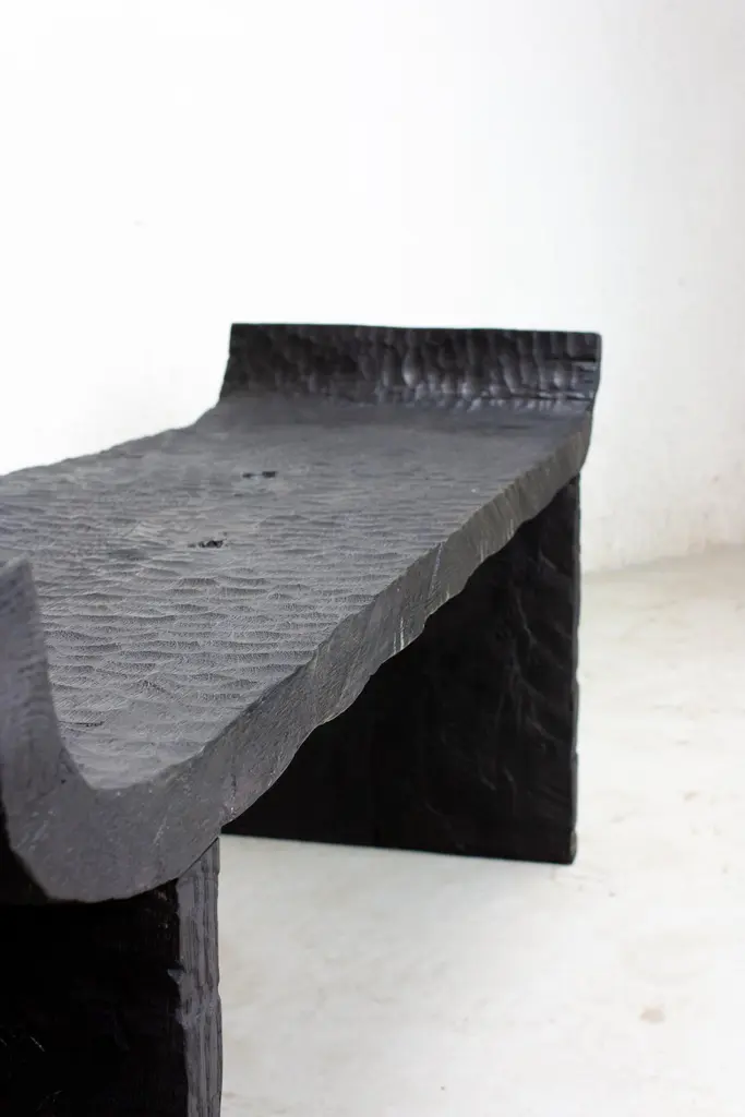 BenchSculpted wood (solid oak)Finish: hammered, dark[Suitable for outdoor use]SÓHA design studio conceives and produces furniture design and decorative objects in solid oak in an authentic style. Inspiration to create all these items comes from the Russian North aesthetics with its severe nature, log huts black from time and climate and scant patterns. Wood is masterfully hand processed with chainsaw or chisel, whereby producing beautiful surface patterns. The wood is soaked in boiling baths of linseed oil, creating this special patina and making each creation a very unique piece. Reacting with tanning substances under high temperature, oil gives the objects expressive and natural colours, from light brown to charcoal-black. SÓHA offers a vast array of neo-primitivist interior objects. Our kitchen utensil, wall panels, sculptures and furniture solutions are executed in one unique style and will organically fit into the interior of your home. Each piece is one-of-a-kind handmade product.