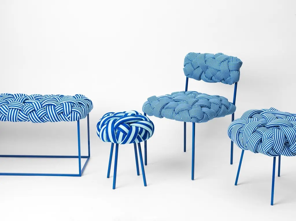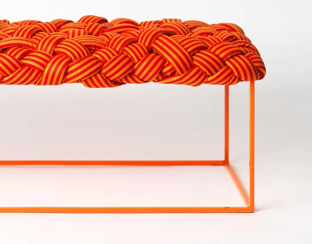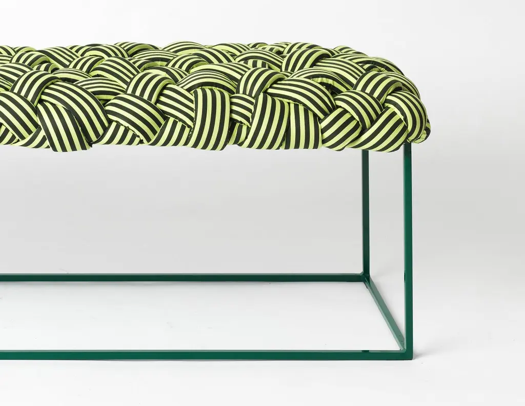 This contemporary bench is part of the Cloud collection, which was created around the concept of trees. The pieces are made with cotton fabric and foam stripes, woven and stitched by hand. Each piece is unique, as the result of the manual process of fabrication. Dimensions for this contemporary piece may vary within a 5 cm limit due to the manual manufacturing process.