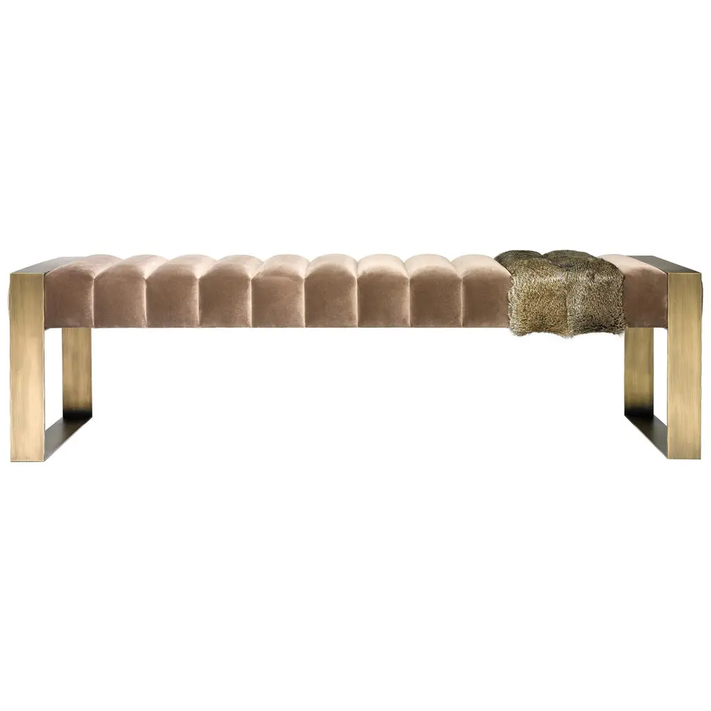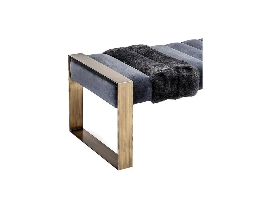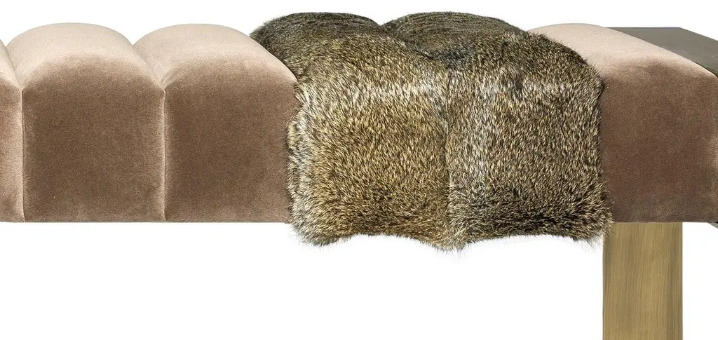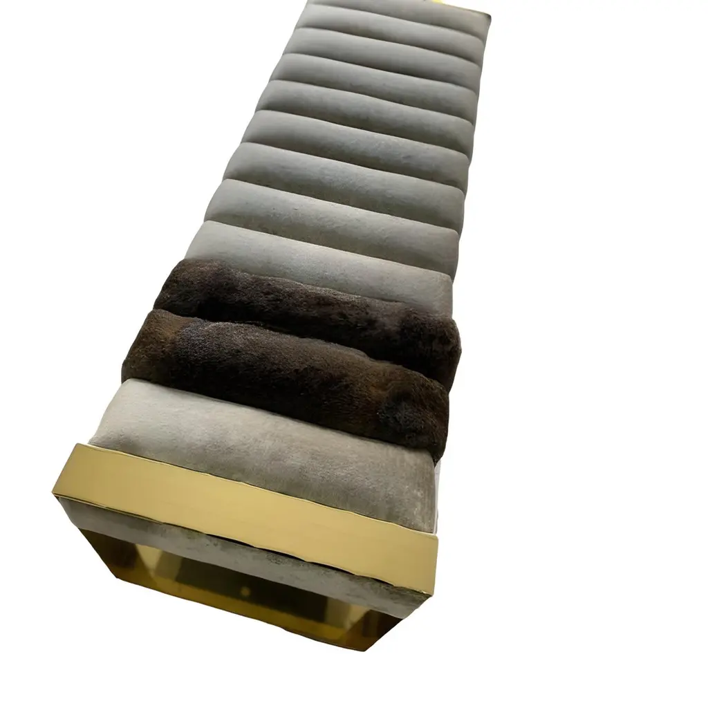 Contemporary bench is a statement design piece. This contemporary upholstered piece with an interesting twist of two fur strips. It evokes strength with the use of straight lines while the fur elements add a touch of luxury. This is an incredibly versatile piece in a variety of colors.Shown in red velvet with two stripes in rabbit red fur . Structure in carved light bronze. Available in our range of fabrics, and furs. Specify desired fur and velvet color from images. Dimensions:Width 160cm 63”Depth 50cm 20”Height 45cm 18”.We will be glad to check with the factory’s technical team if sizes, finishes, and colors can be customized. We do our best to expedite production and to ship and deliver product within the listed lead time, however current lead times might be longer due to global shipping backlog and delays. These delays are out of our control and cannot be a reason to cancel an order.