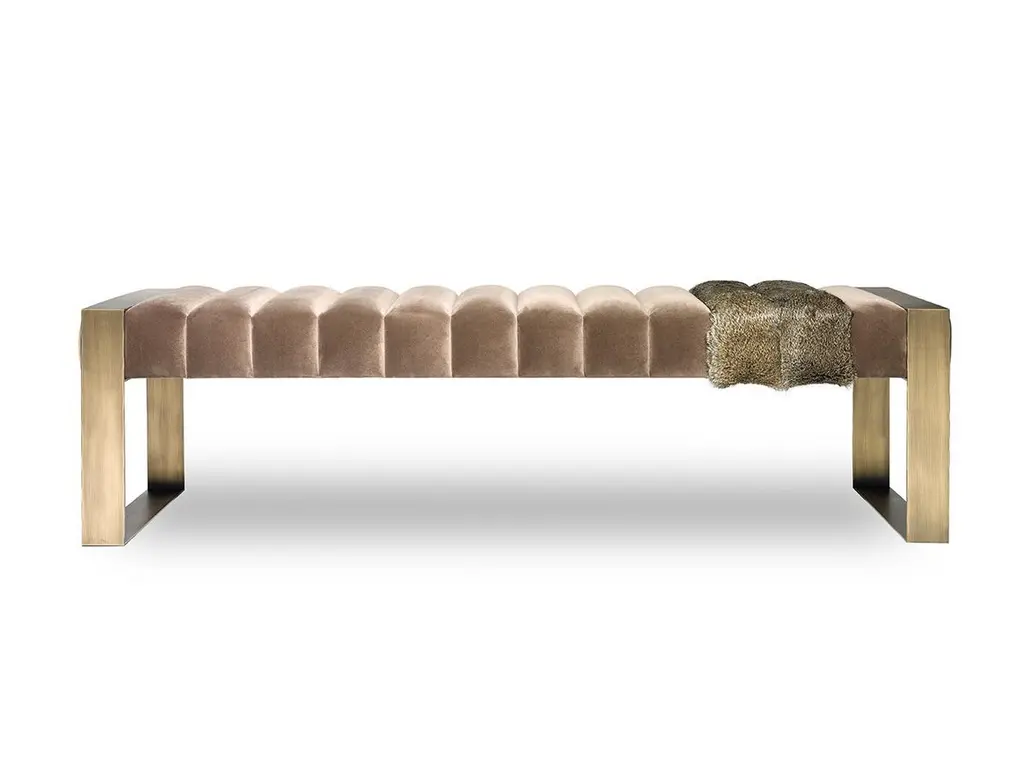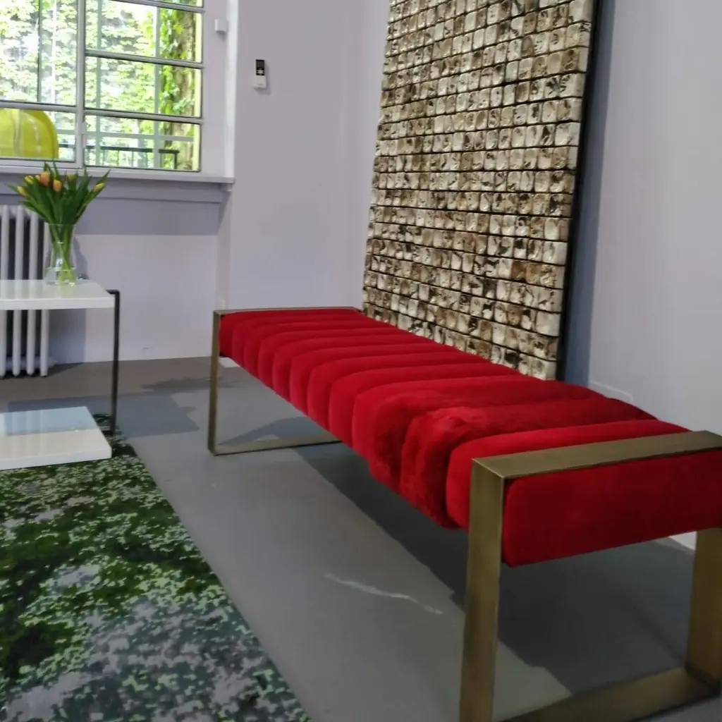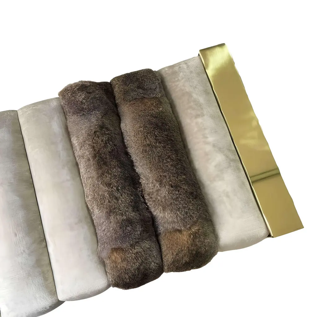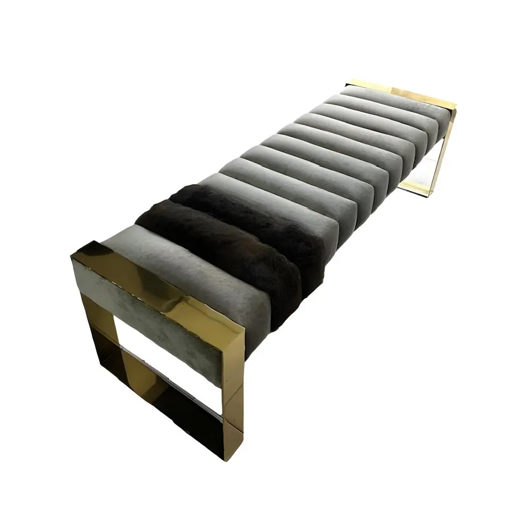 Contemporary bench is a statement design piece. This contemporary upholstered piece with an interesting twist of two fur strips. It evokes strength with the use of straight lines while the fur elements add a touch of luxury. This is an incredibly versatile piece in a variety of colors.Shown in red velvet with two stripes in rabbit red fur . Structure in carved light bronze. Available in our range of fabrics, and furs. Specify desired fur and velvet color from images. Dimensions:Width 160cm 63”Depth 50cm 20”Height 45cm 18”.We will be glad to check with the factory’s technical team if sizes, finishes, and colors can be customized. We do our best to expedite production and to ship and deliver product within the listed lead time, however current lead times might be longer due to global shipping backlog and delays. These delays are out of our control and cannot be a reason to cancel an order.