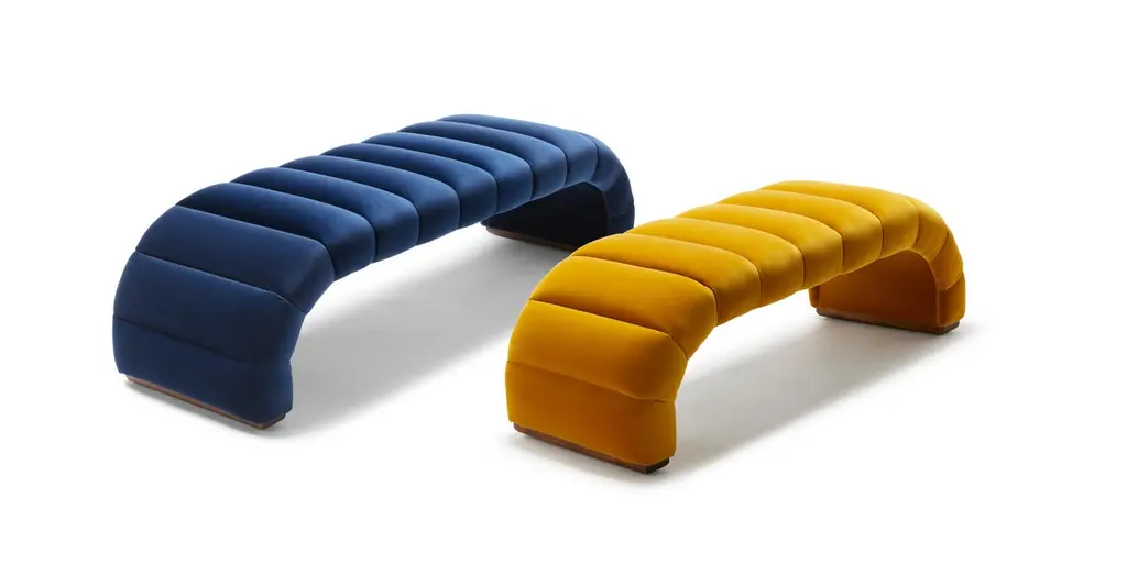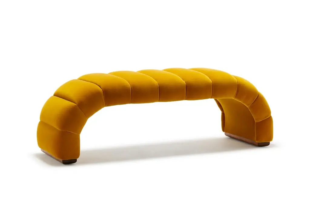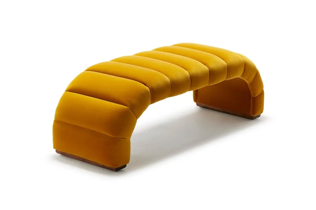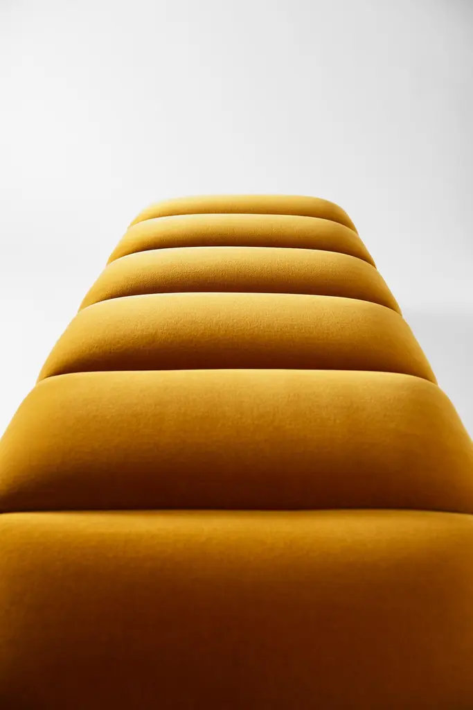 Contemporary Channeled Fleure Bench Midi In Yellow Velvet With Walnut Feet