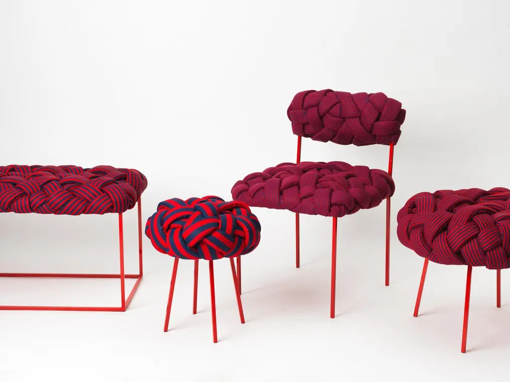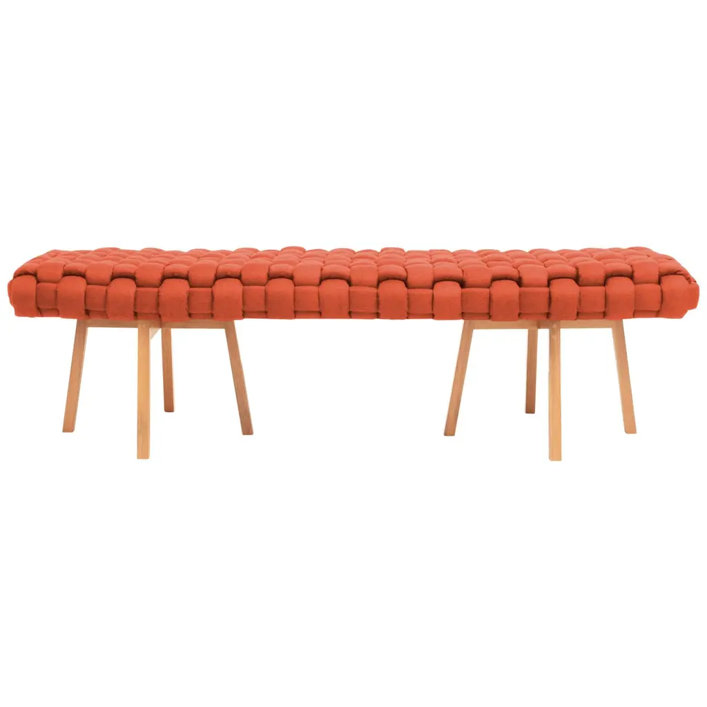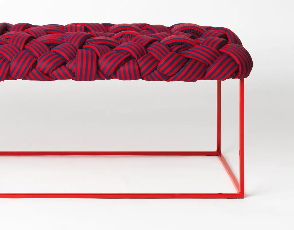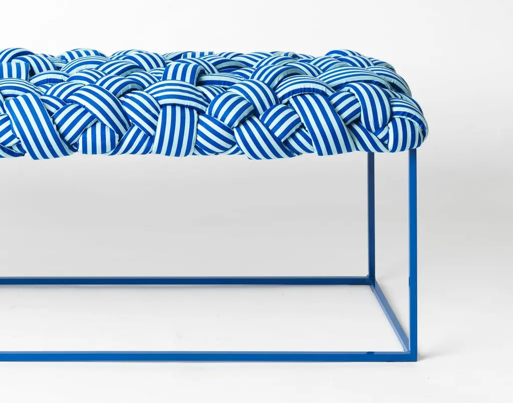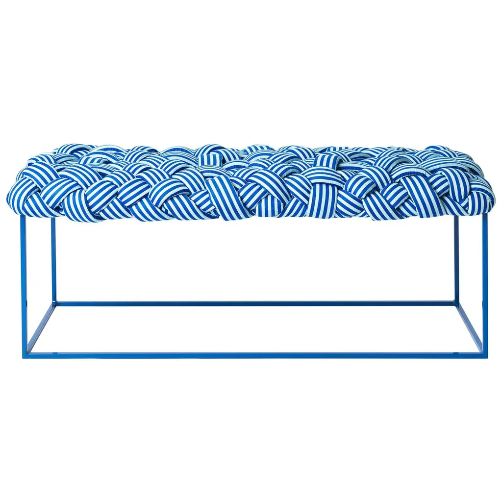 This contemporary bench is from the Cloud collection, which was created around the concept of trees. These contemporary pieces are made with cotton fabric and foam stripes, woven and stitched by hand. Each bench is unique, as the result of the manual process of fabrication. Dimensions may vary within a 5 cm limit due to manual manufacturing process.