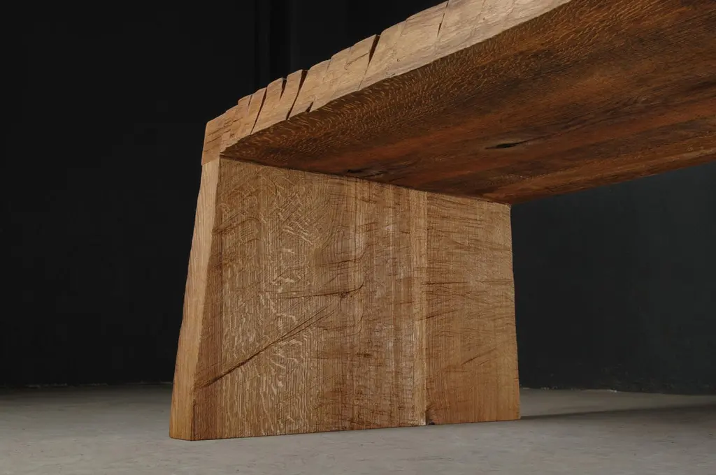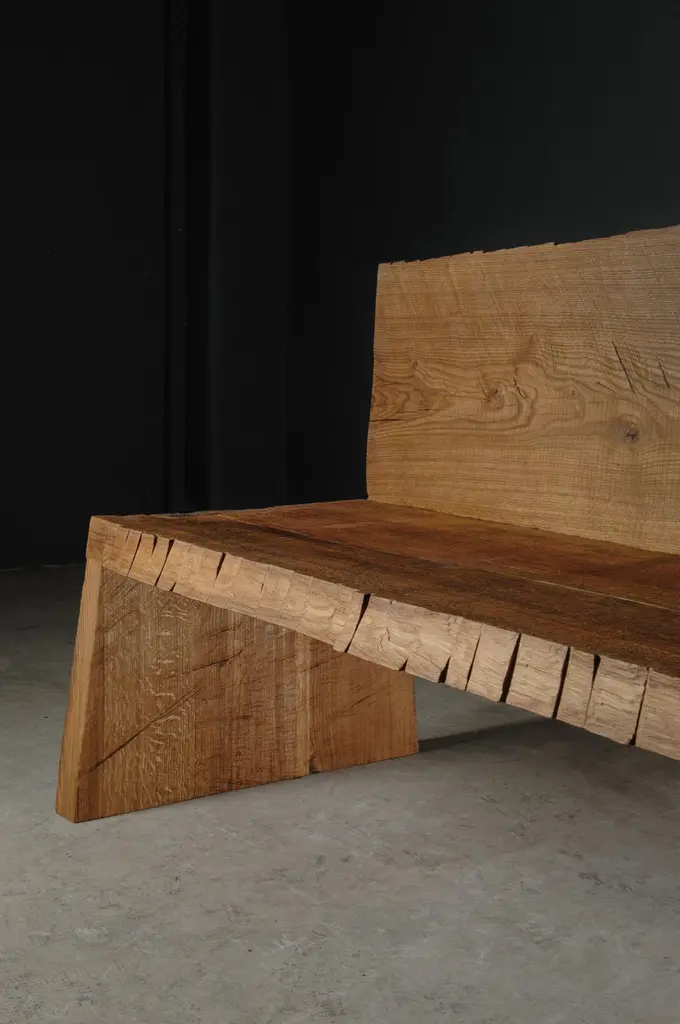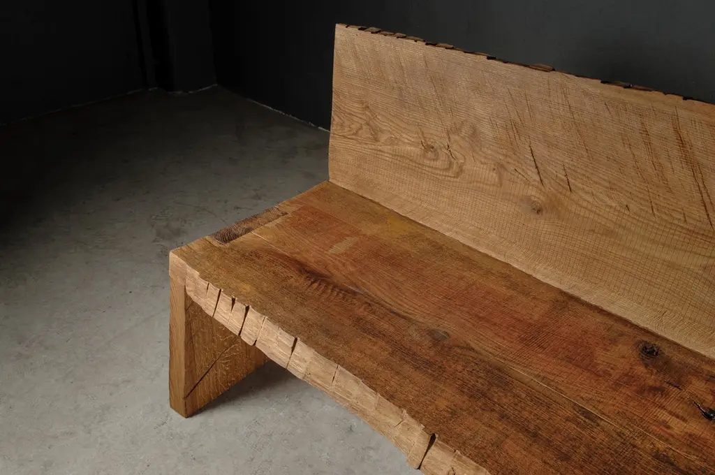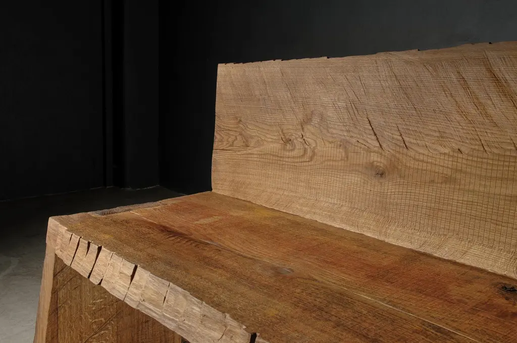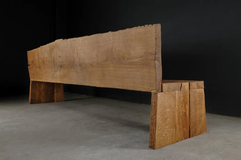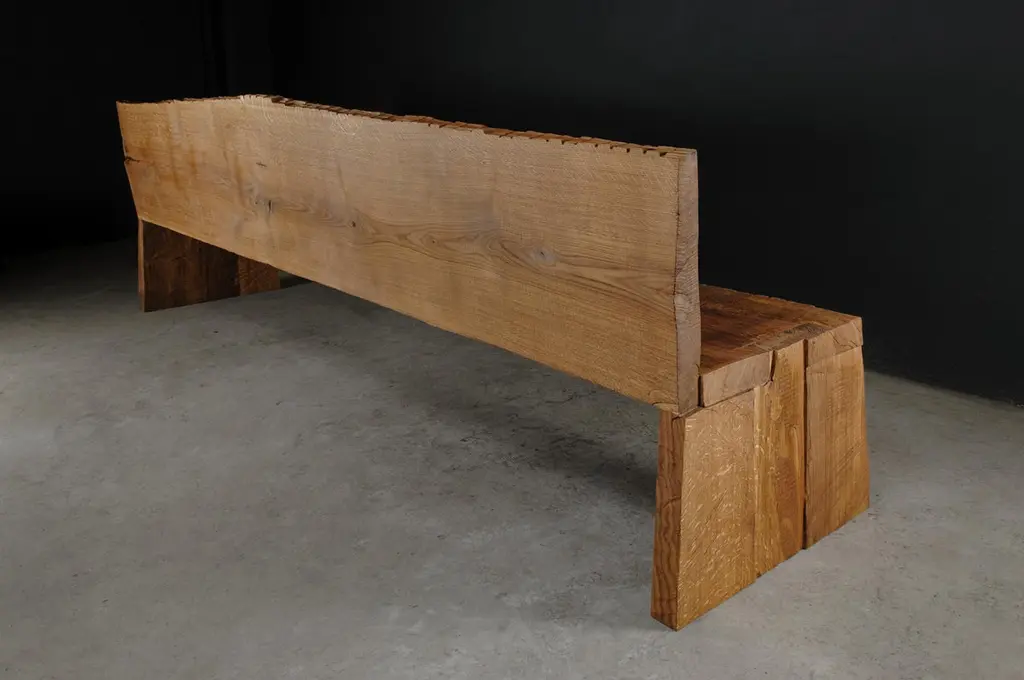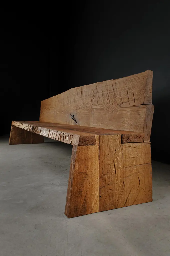 Contemporary Sculpted Big Bench with Backrest by Soha, Solid Oak (+ linseed oil)Dimensions:H. 85 x 300 x 45 cm / SH. 45 cmUnique piece made to order------SÓHA design studio conceives and produces furniture design and decorative objects in solid oak in an authentic style. Inspiration to create all these items comes from the Russian North aesthetics with its severe nature, log huts black from time and climate and scant patterns. Wood is masterfully hand processed with chainsaw or chisel, whereby producing beautiful surface patterns. The wood is soaked in boiling baths of linseed oil, creating this special patina and making each creation a very unique piece. Reacting with tanning substances under high temperature, oil gives the objects expressive and natural colours, from light brown to charcoal-black. SÓHA offers a vast array of neo-primitivist interior objects. Our kitchen utensil, wall panels, sculptures and furniture solutions are executed in one unique style and will organically fit into the interior of your home. Each piece is one-of-a-kind handmade product.