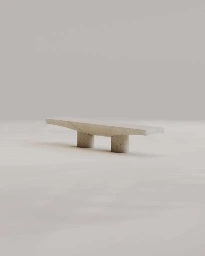 Introducing the "Abraccio" Collection or translated "embrace" Collection unites the enduring beauty of solid carved marble with a language of form that pays homage to primitive structures. Two primal shaped columns support a commanding horizontal solid slab. It becomes a conversation between classical and contemporary, nature and craftsmanship, geometric precision and organic shapes. Yet, it's the ellipsoid embrace that truly defines the collection's character. These graceful curves, meticulously carved into the stone, encircle the columns like an enigmatic story waiting to be deciphered. This ellipsoidal motif not only adds a layer of visual allure but also imparts a sense of unity and balance, bridging the gap between the geometric precision of the columns and the softer lines of the surrounding space.Hand crafted solid marble by Serafini. Each stone will be selected together with the client to create the desired effect. Custom stones/marbles are possible upon request. We can also do different sizes.