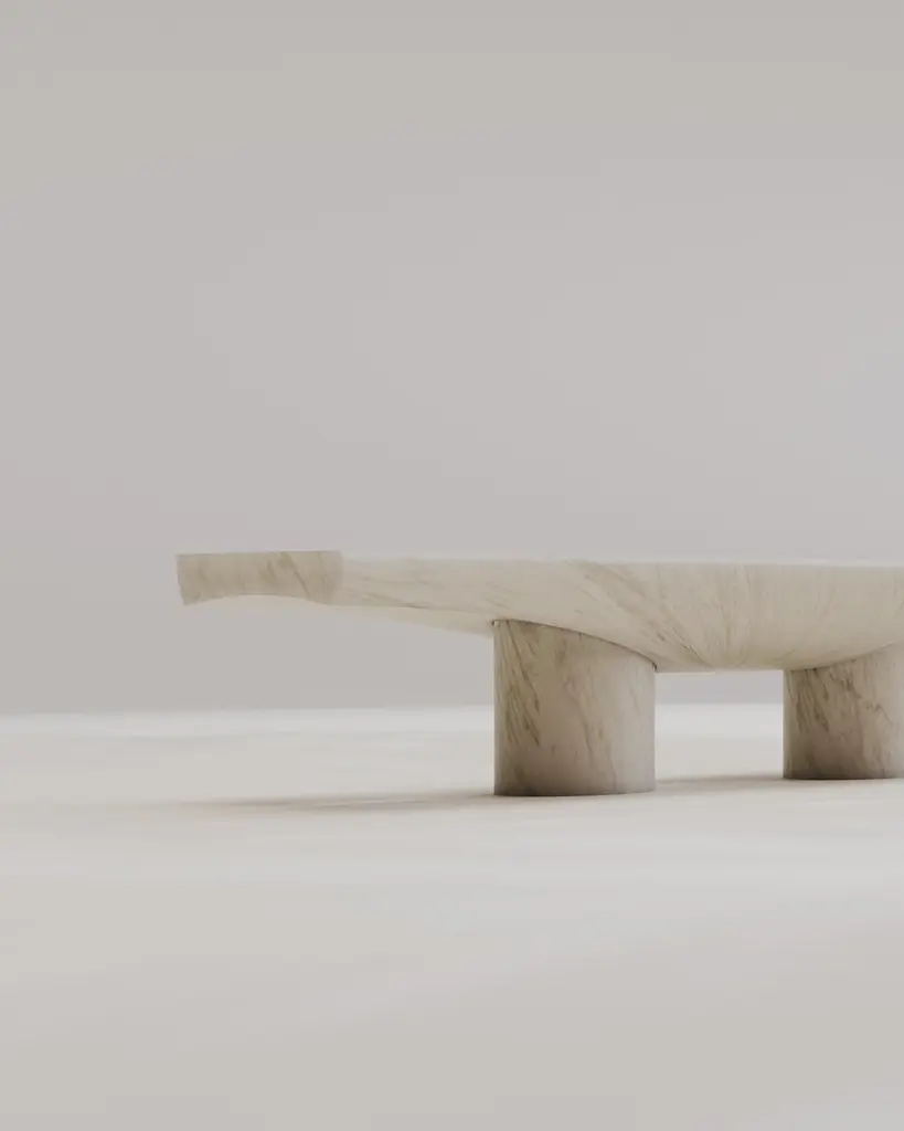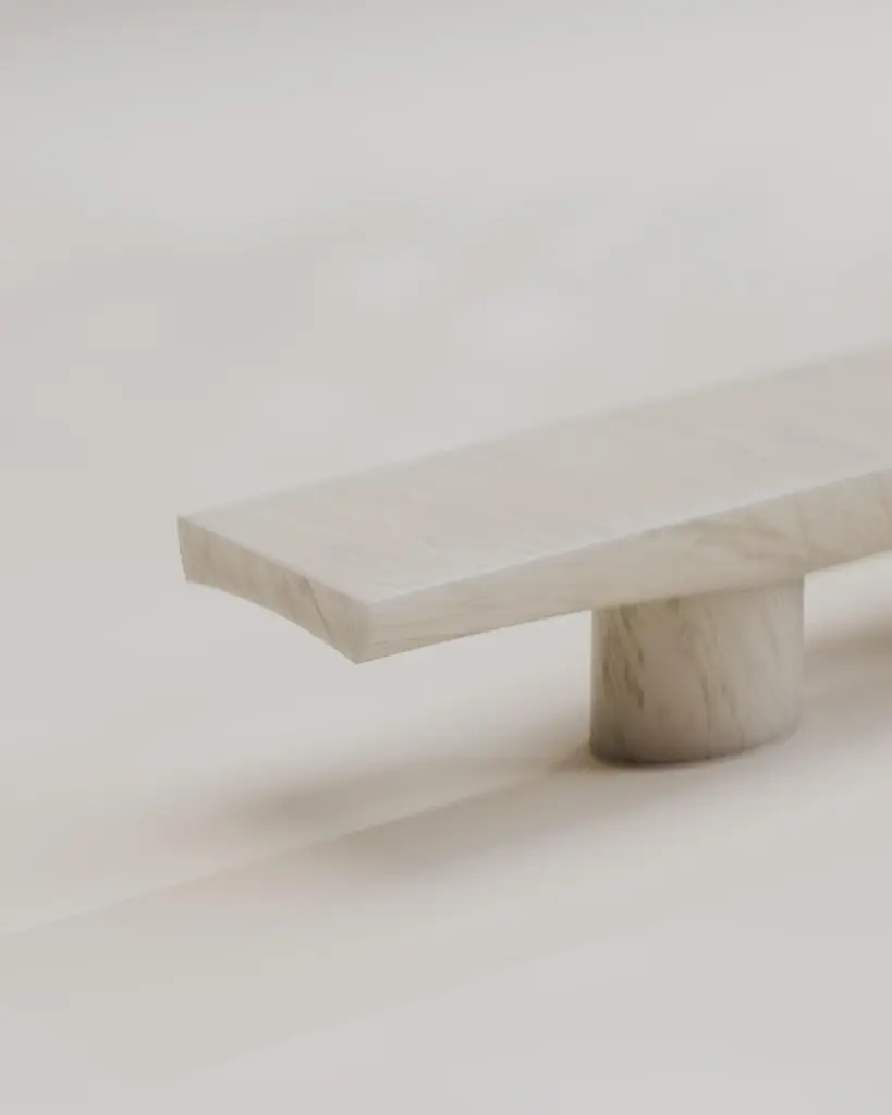 Introducing the "Abraccio" Collection or translated "embrace" Collection unites the enduring beauty of solid carved marble with a language of form that pays homage to primitive structures. Two primal shaped columns support a commanding horizontal solid slab. It becomes a conversation between classical and contemporary, nature and craftsmanship, geometric precision and organic shapes. Yet, it's the ellipsoid embrace that truly defines the collection's character. These graceful curves, meticulously carved into the stone, encircle the columns like an enigmatic story waiting to be deciphered. This ellipsoidal motif not only adds a layer of visual allure but also imparts a sense of unity and balance, bridging the gap between the geometric precision of the columns and the softer lines of the surrounding space.Hand crafted solid marble by Serafini. Each stone will be selected together with the client to create the desired effect. Custom stones/marbles are possible upon request. We can also do different sizes.